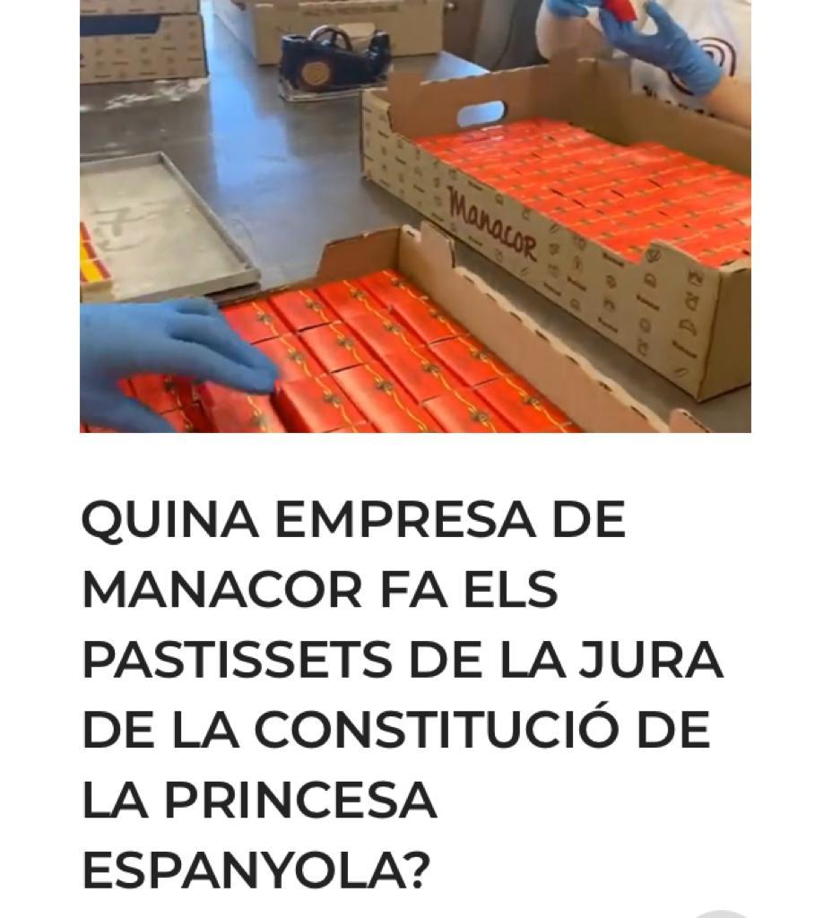 La Comunitat Autònoma de Madrid, comandada per Isabel Díaz Ayuso, va decidir regalar uns pastissets amb la bandera d’Espanya als assistents a l’acte de jura de constitució de la princesa Elionor. La sorpresa arribà en veure que les capses que contenien els pastissets duien el nom de Manacor…