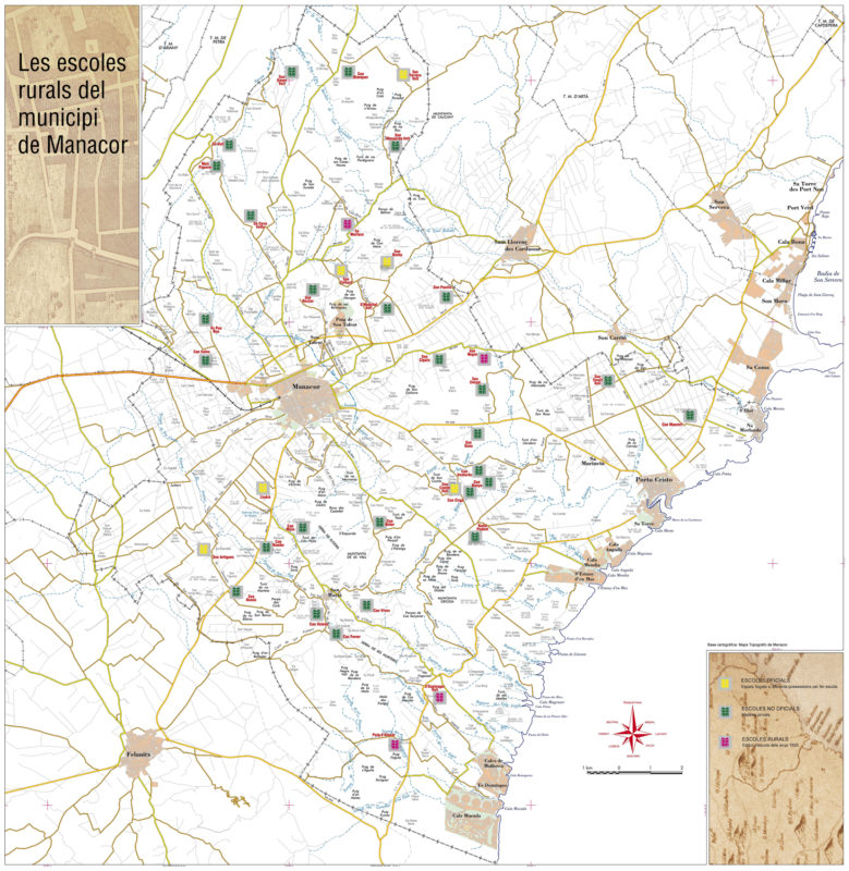 Com es destria en el mapa, el terme manacorí va comptar amb 37 escoles rurals, la majoria de les quals, però, no eren oficials. En molts de casos eren els mestres qui de forma itinerant s’acostaven a les diferents possessions per garantir la formació dels infants que habitaven per fora vila.