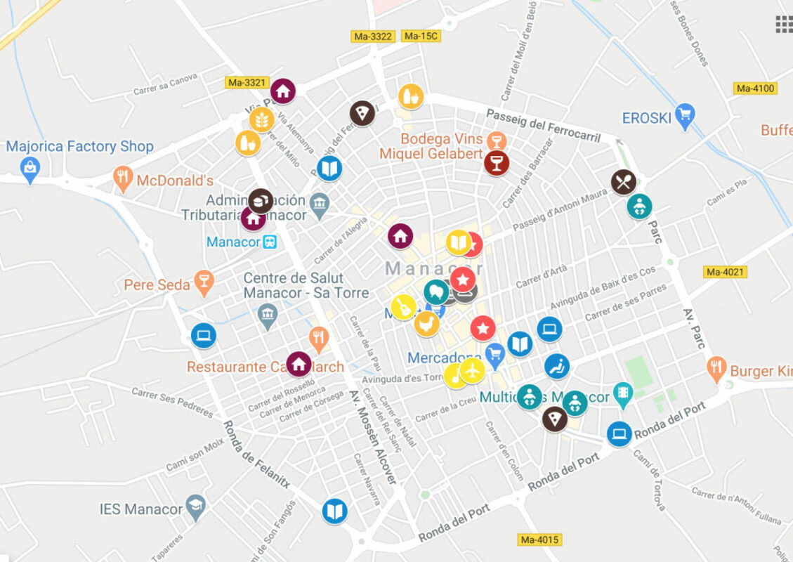 Més Salut, la Creperia, Ca’n March, Mercadona, Ca’n Garanya, Vins Miquel Gelabert, Pere Seda, Sa Fonda, Pollos Salas, Ofi-illa… Aquests són alguns dels comerços i negocis que ofereixen serveis a través d’Internet a Manacor i que formen part del mapa interactiu que la la Fundació Bit ha elaborat perquè tenguem accés directe a empreses i entitats que ofereixen servei via e-commerce o també per correu electrònic o eines de missatgeria com ara whatsapp. Entre altres ens que també hi figuren hi ha l’IES Manacor, l’Acadèmia de Rafel Nadal, els Multicines Manacor o la Parròquia dels Dolors.