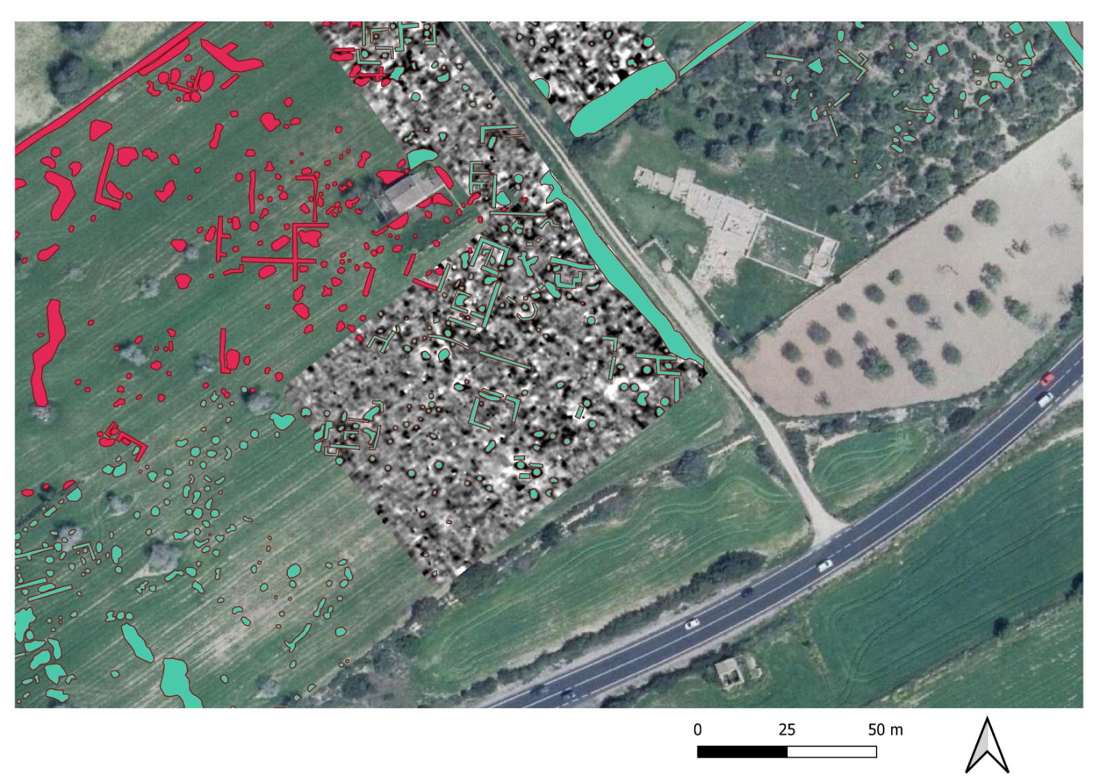 Les prospeccions geofísiques varen posar al descobert tota una sèrie de murs que conformen nous edificis i habitacions. En el plànol d’anomalies es veu clarament l’existència de murs i habitacions al voltant de la casa moderna dins aquesta parcel·la. A més, durant la campanya realitzada en el 2020 es va localitzar un sitjot en el límit de la parcel·la igual que els que hi ha a la parcel·la 103 que és propietat municipal. A les dues parcel·les que es volen adquirir per tant s’observen gran quantitat d’anomalies magnètiques que es corresponen amb parets, murs de fonamentació, forats de pal, tombes, concentracions d’objectes metàl·lics i ceràmics.