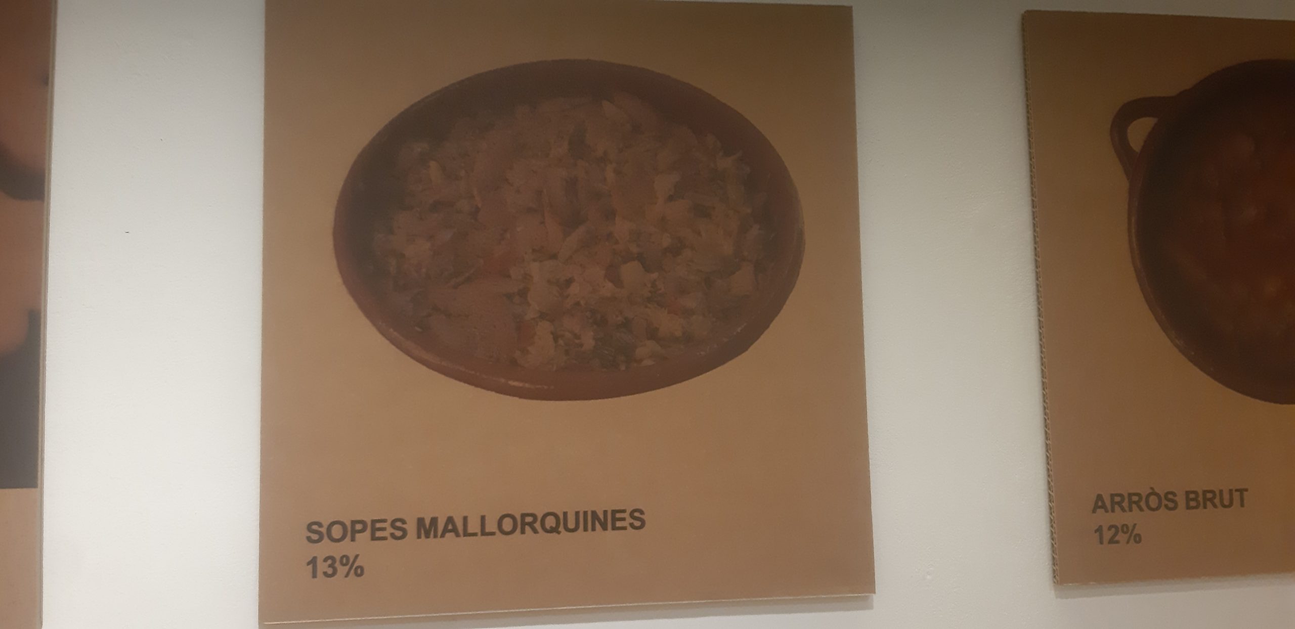 En uns dels plafons vaig poder llegir sopes mallorquines. Vaig pensar que les sopes són mallorquines per haver-se cuinades a Manacor, o a la resta de l’illa, però que hi ha moltíssimes de maneres de cuinar-les, per tant, si només hagués anunciat el plafó: sopes, n’hi hauria hagut ben prou. Com les panades que encara no deim, per sort, panades mallorquines, tot i que per qualque forn de Ciutat adreçat als turistes, ja he vist anunciat pizza mallorquina, per referir-se a la coca de trempó.