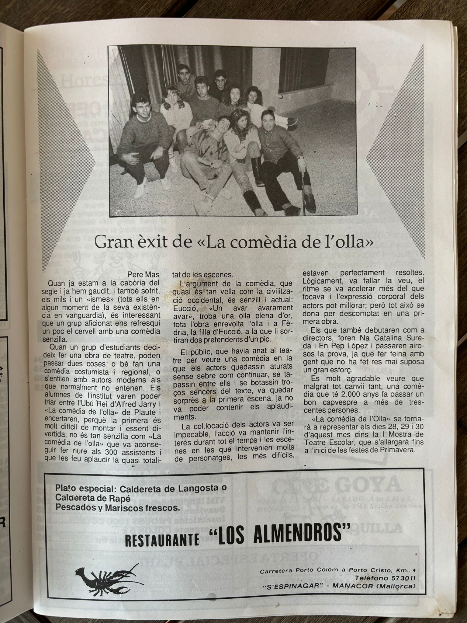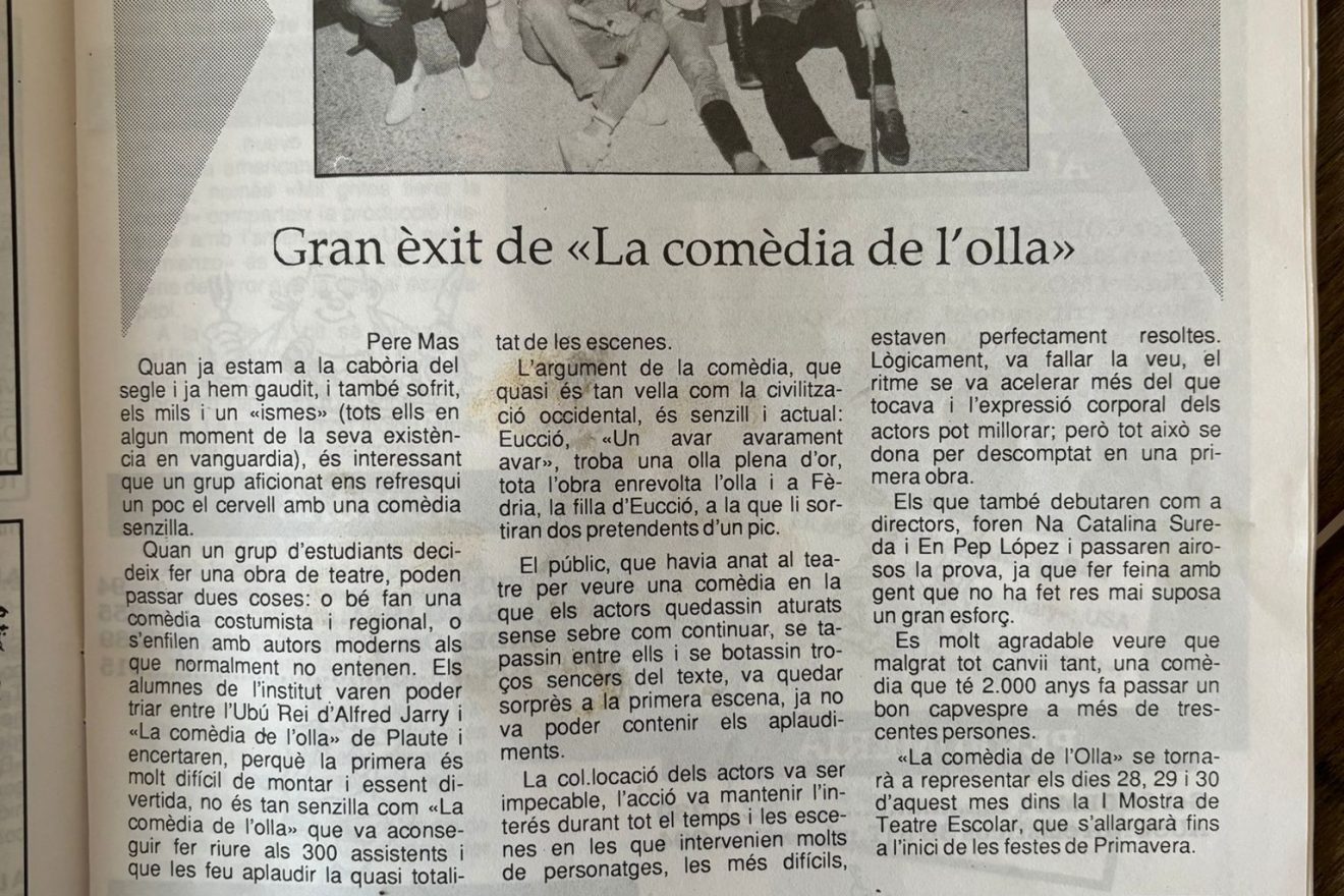 La Mostra de Teatre Escolar de Manacor celebra 40 primaveres. 40 anys de llegir, subratllar i memoritzar, d’estructurar cervellets, de maquillatges i vestuaris, d’aixecar muntatges, d’assajos generals i de nervis a la panxa. Però també quaranta anys de crear teixit cultural, de difondre llengua i d’estimar el teatre.