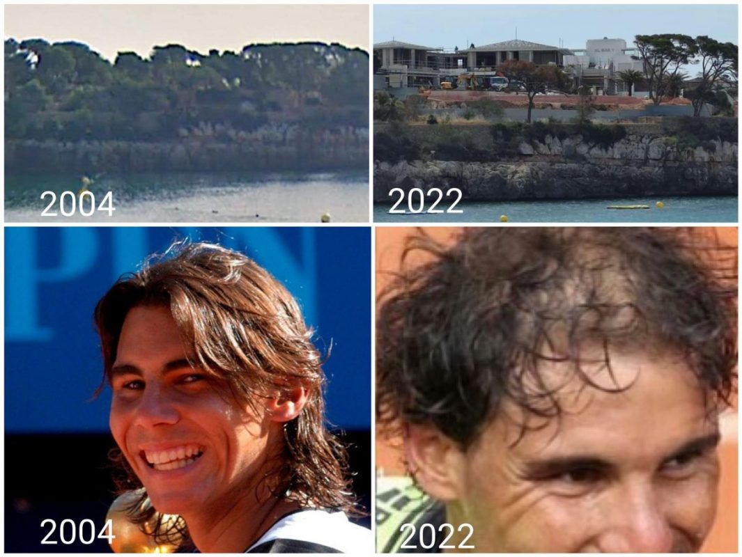 Els companys del DeFrancDigital han publicat dues imatges comparatives de com ha quedat l’antic solar de ca donya Carme Servera, avui ca don Rafel Nadal. L’impacte visual és evident. Molts menys pins. Molta més edificació. Al punt han sortit mems a les xarxes com aquest, que va adornat amb el proverbi xinès: “Allò que fas a la mare natura t’ho fas a tu mateix”, i una comparativa de la cabellera juvenil del tennista ara fa devuit anys i la seva lluita actual contra l’alopècia.