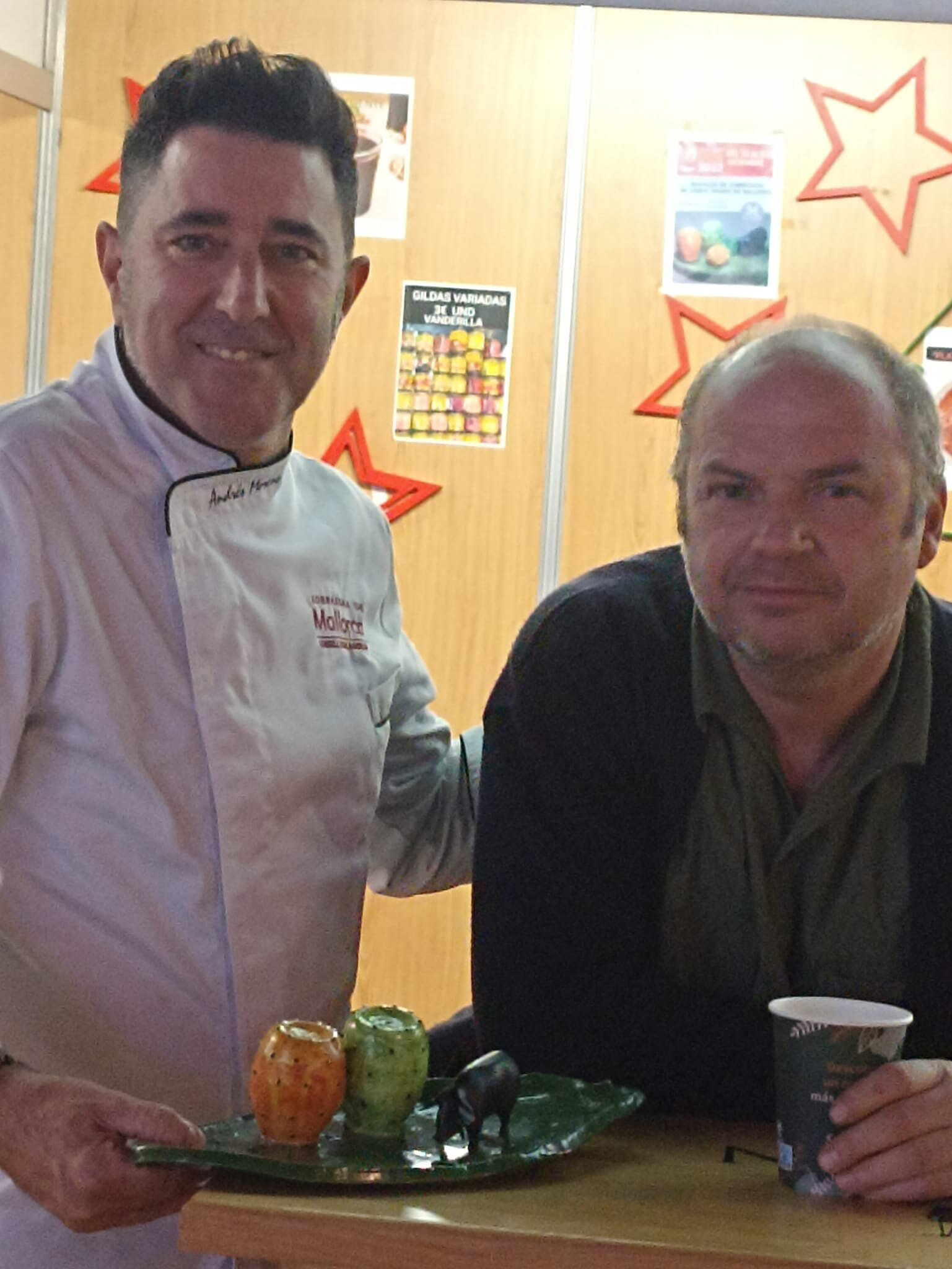 No sortí el tema de les idees polítiques, però sí que, en aquella intensa trobada, Andreu em va dir que estava implicat en l’elaboració de tapes amb productes mallorquins i que rebia ajuda de l’associació de criadors de porc negre, ja que emprava la seva sobrassada en les seves creacions. Per aquest motiu em mostrà l’emblema d’aquesta entitat que duia cosit a la jaqueta del seu uniforme de cuiner. De fet, la seva professió és la de cuiner encara que en aquells moments es trobava a l’espera d’un nou contracte i havia vengut a la fireta a fer un poc de promoció amb un company seu a qui també vaig conèixer; Juanjo Escolano.