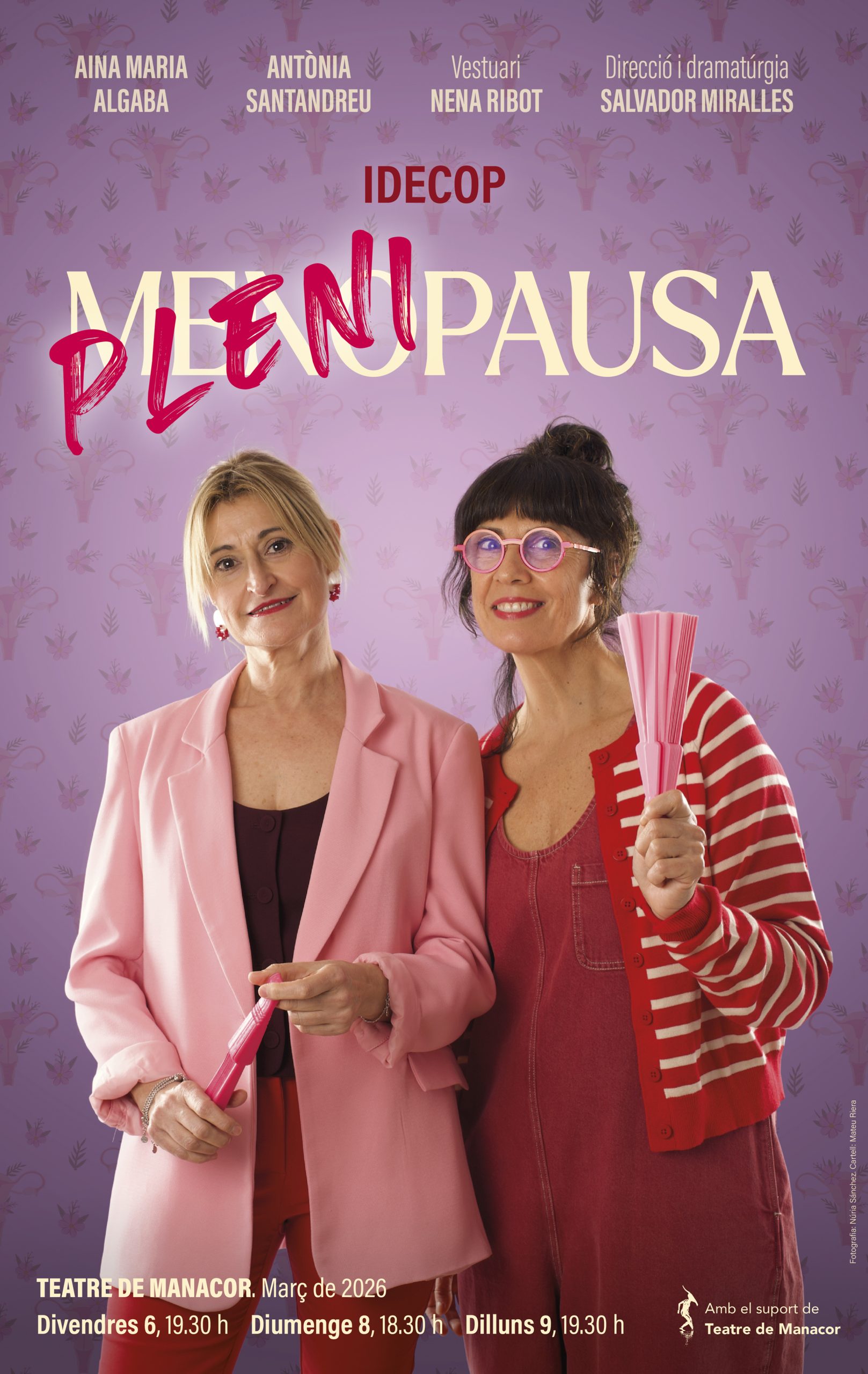 El Teatre de Manacor acull el pròxim mes de març Pleni-pausa, un espectacle teatral que aborda la menopausa des de l’humor, la veritat i la tendresa, amb la interpretació d’Aina Maria Algaba i Antònia Santandreu, direcció i dramatúrgia de Salvador Miralles i amb la participació de Maria Servera en l’assessoria lingüística i Nena Ribot al vestuari.