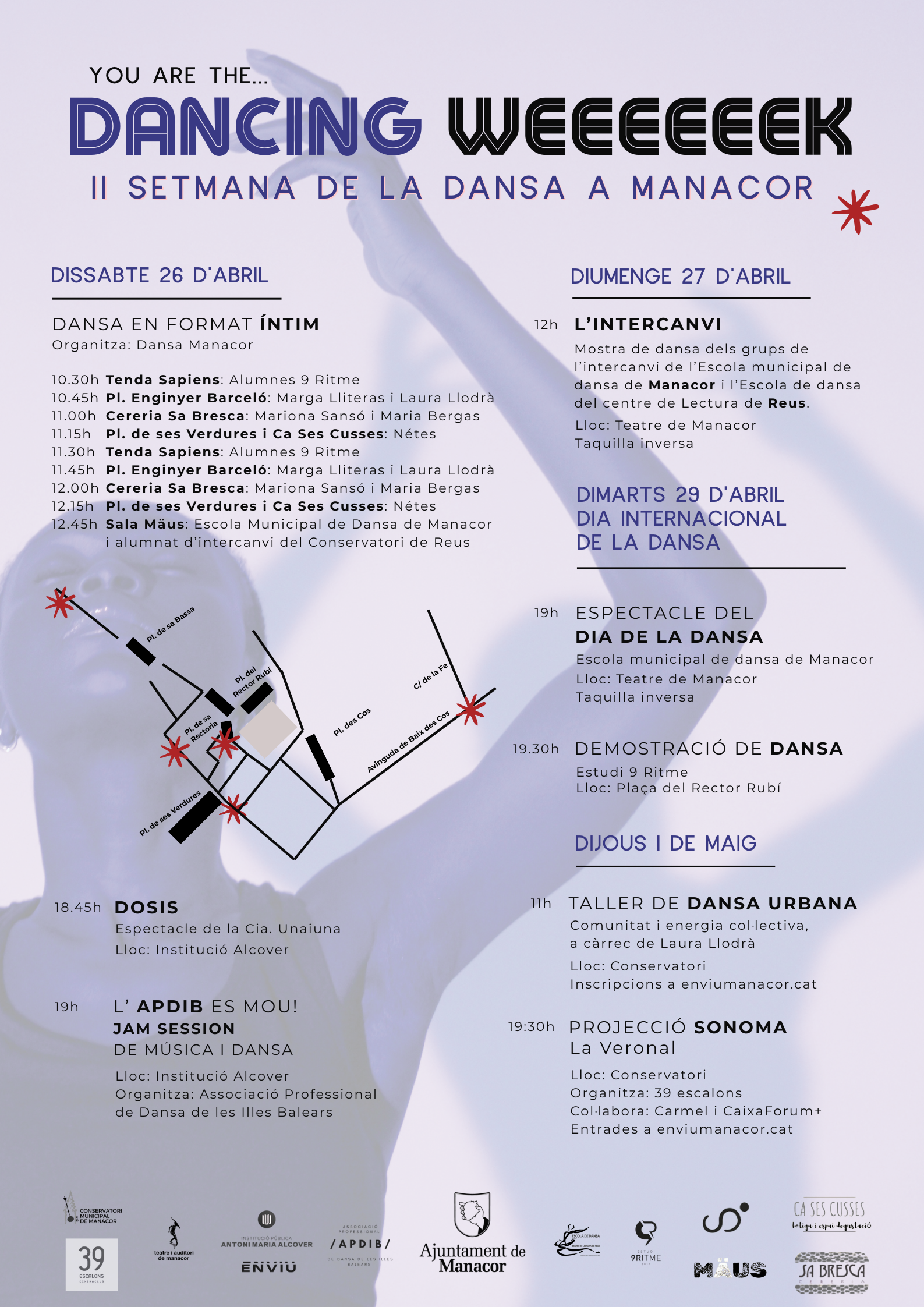 Del 26 d’abril a l’1 de maig, Manacor acollirà la segona edició de la Setmana de la Dansa, una proposta cultural i comunitària que, amb el nom de DANCING WEEEEEEK, omplirà els carrers i espais de la ciutat amb activitats relacionades amb la dansa: espectacles, tallers, projeccions i accions a peu de carrer.