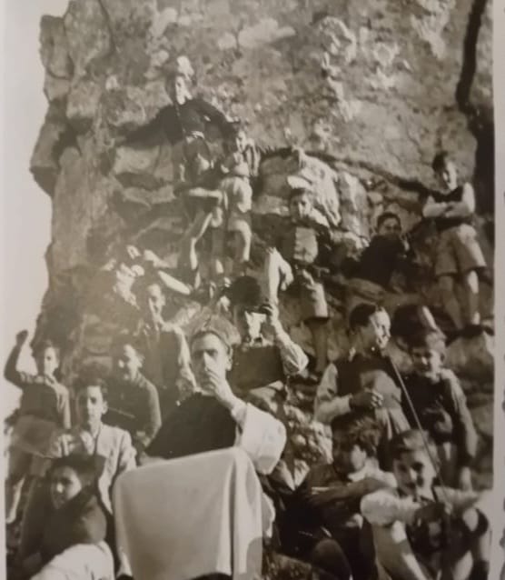 Excursió amb alumnes del Col·legi Apostòlic. Fotografia publicada al recull L’avenç i que es podria datar entre els anys 40 i 50 del segle passat.