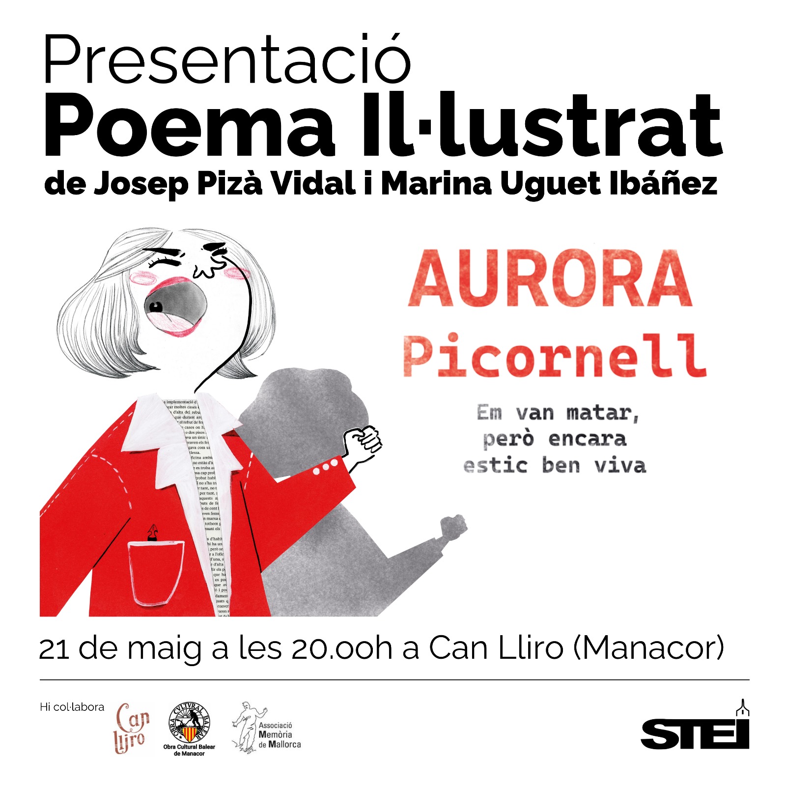 L’Obra Cultural Balear de Manacor, amb la col·laboració de l’STEI, presenta demà a les 20 h el poema il·lustrat de Josep Pizà i Marina Uguet sota el títol: “Aurora Picornell: em van matar, però encara estic ben viva”. Es tracta del reconeixement i de la reconstrucció d’un símbol de militància feminista, laïcista, comunista i de reivindicació de la classe obrera, amb un potencial icònic molt gran per Mallorca.