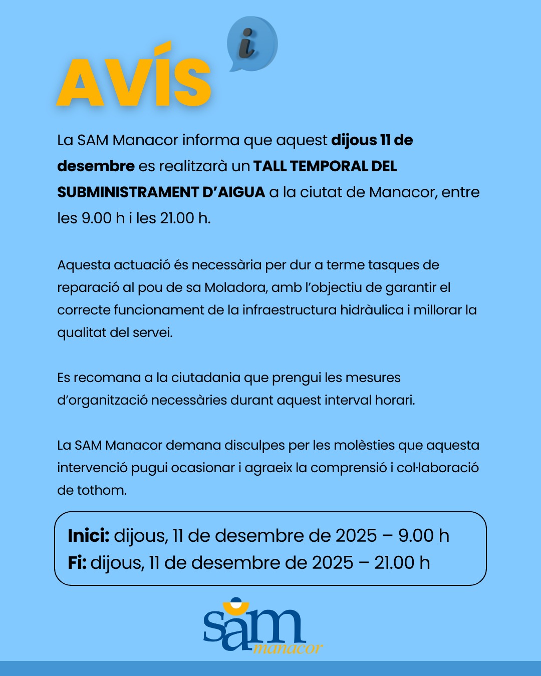 Alerta: dijous Manacor estarà 12 hores sense aigua