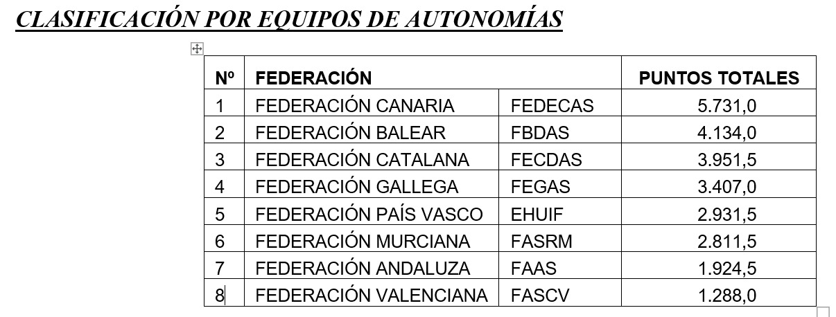 El Campionat d’Espanya és individual, però també, tenint en compte les puntuacions de cada participant, es fa una classificació autonòmica amb la suma de punts dels millors classificats masculins i femenins. L’equip balear va aconseguir la segona posició, just després dels amfitrions canaris.