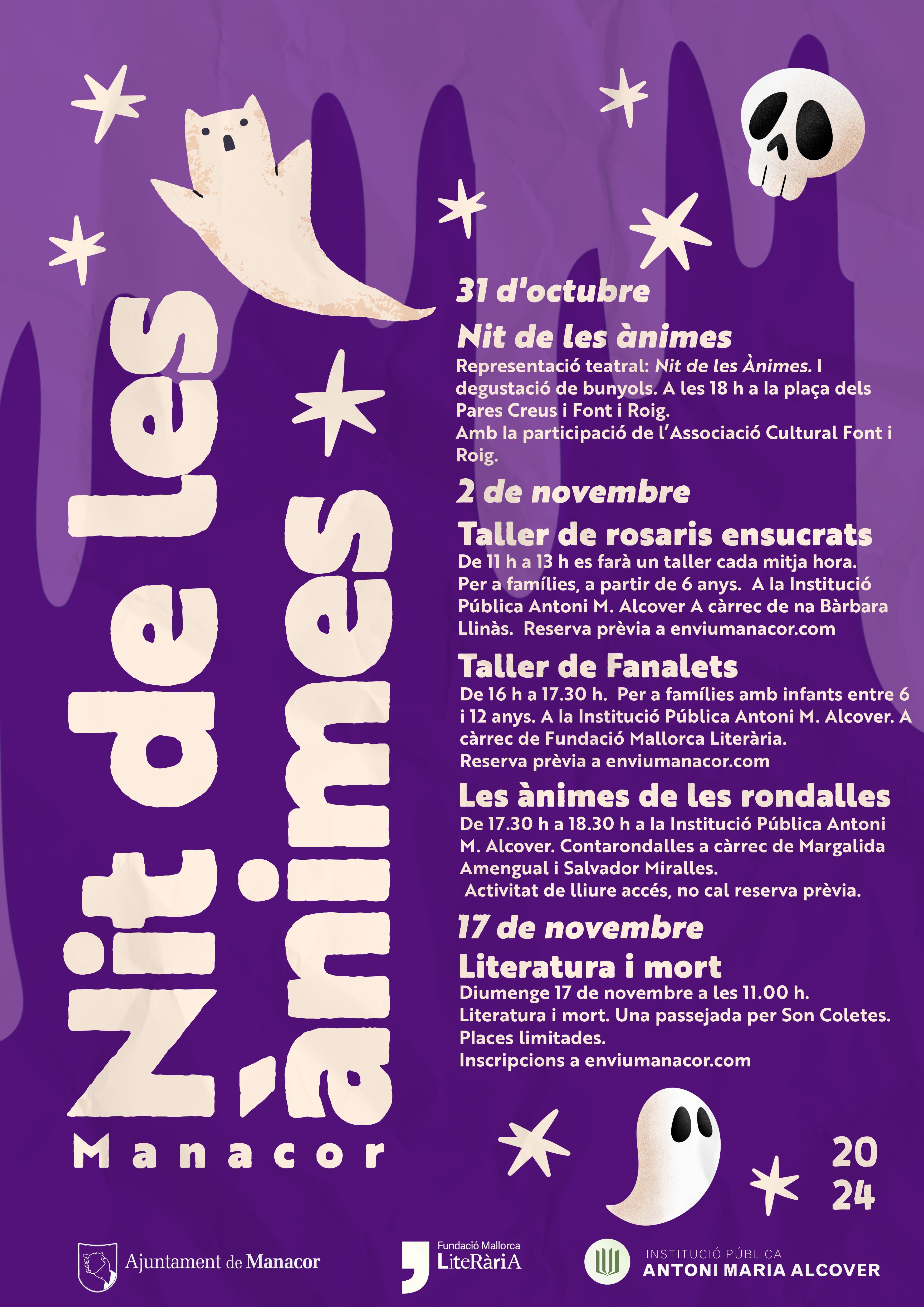 Dia 2 de novembre, els més petits i les seves famílies podran participar en tallers creatius. Al matí, de 11 h a 13 h, tendrà lloc el Taller de rosaris ensucrats a càrrec de la Institució Pública Antoni M. Alcover. El capvespre, de 16 h a 17.30 h, es realitzarà el Taller de fanalets, a càrrec de la Fundació Mallorca Literària, seguit de l’activitat de contacontes “Les ànimes de les rondalles” a partir de les 17.30 h.