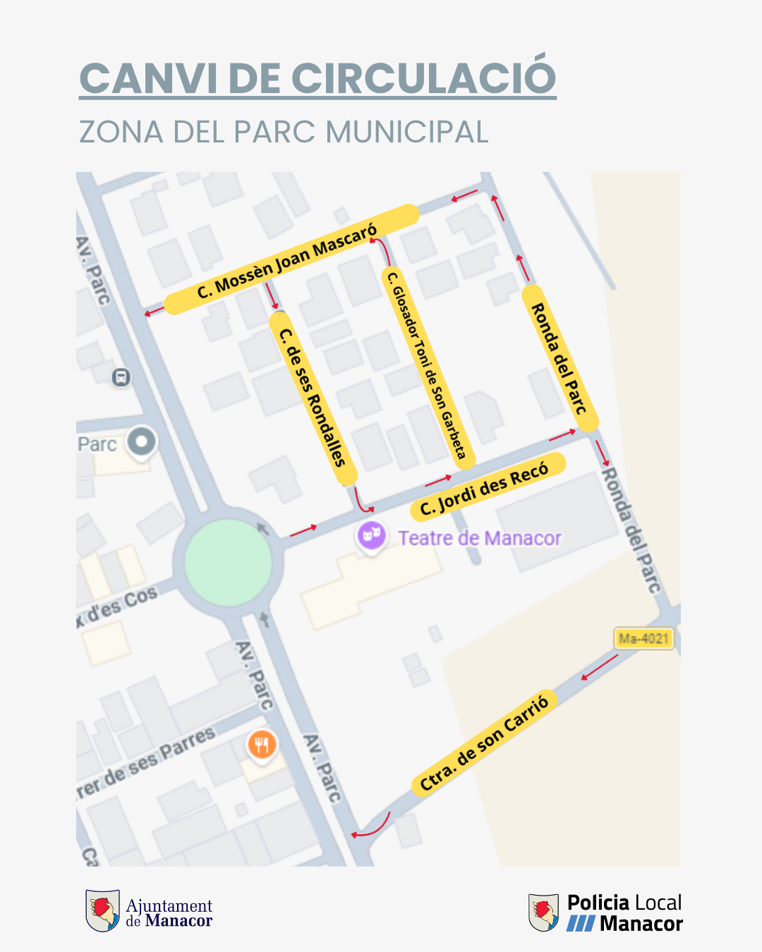 L’Ajuntament de Manacor aplicarà a partir d’aquest diumenge, 12 d’abril, una reorganització del trànsit a la zona del Parc Municipal amb la modificació del sentit de circulació de diversos carrers.