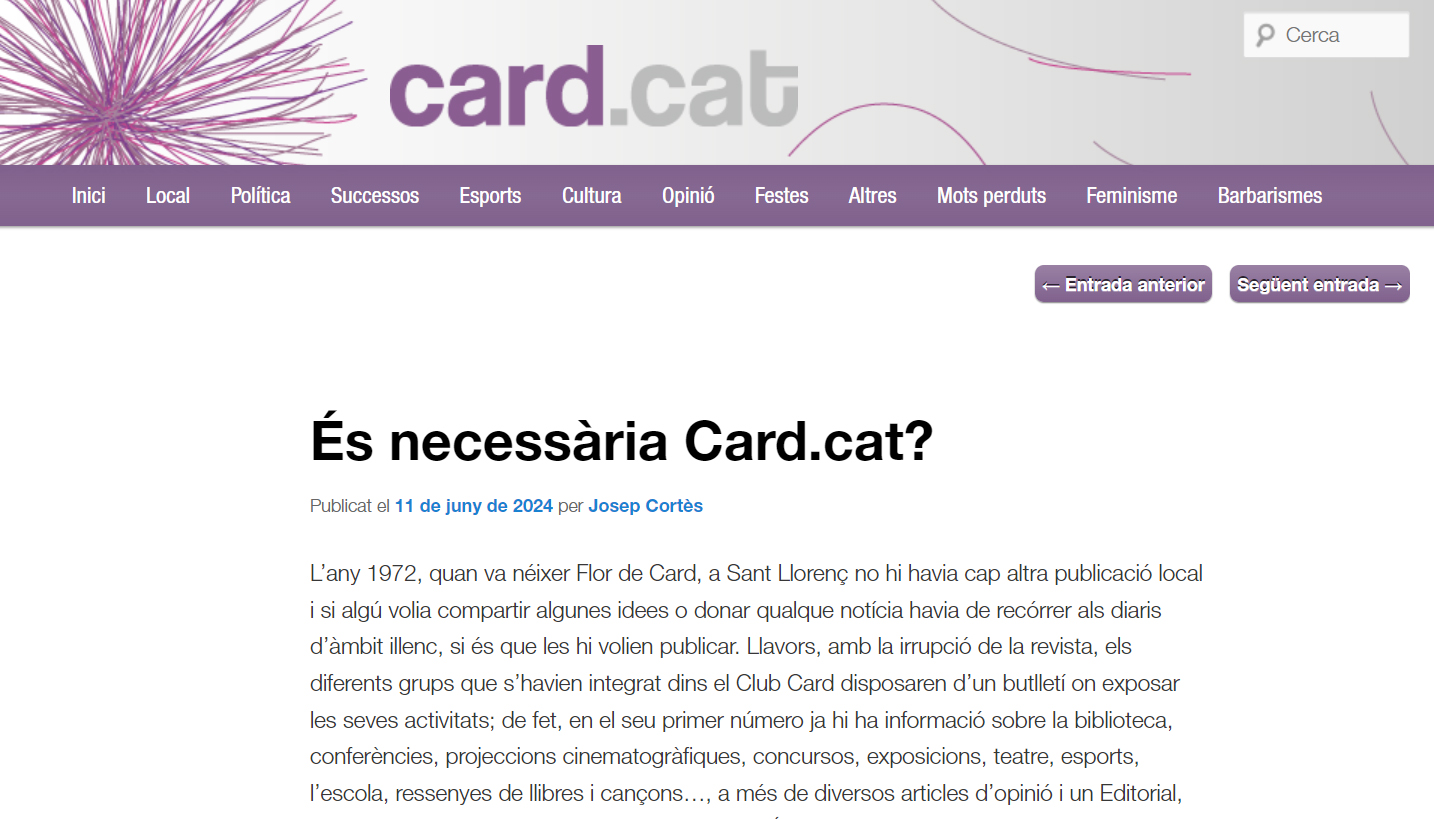 “Amb aquesta situació, potser convendria fer-nos la pregunta de si encara és necessària una publicació com Card.cat, sobretot tenint en compte que des de fa bastants anys no s’hi ha incorporat cap jove que pugui agafar-ne el relleu. De fet, d’entre els cinc que envestírem el projecte (un dels quals, Joan Tomàs Matamalas, se’n cuida de la part tècnica, el que no és poca cosa), un ja ens ha deixat i dos més ja superen amb escreix la setantena”. Així acaba la darrera col·laboració publicada pel cofundador de la web llorencina Card.cat Josep Cortès, Mosca. No estan clares, les coses, devers la publicació germana. Veurem, però com s’acaba d’aclarir la cosa…