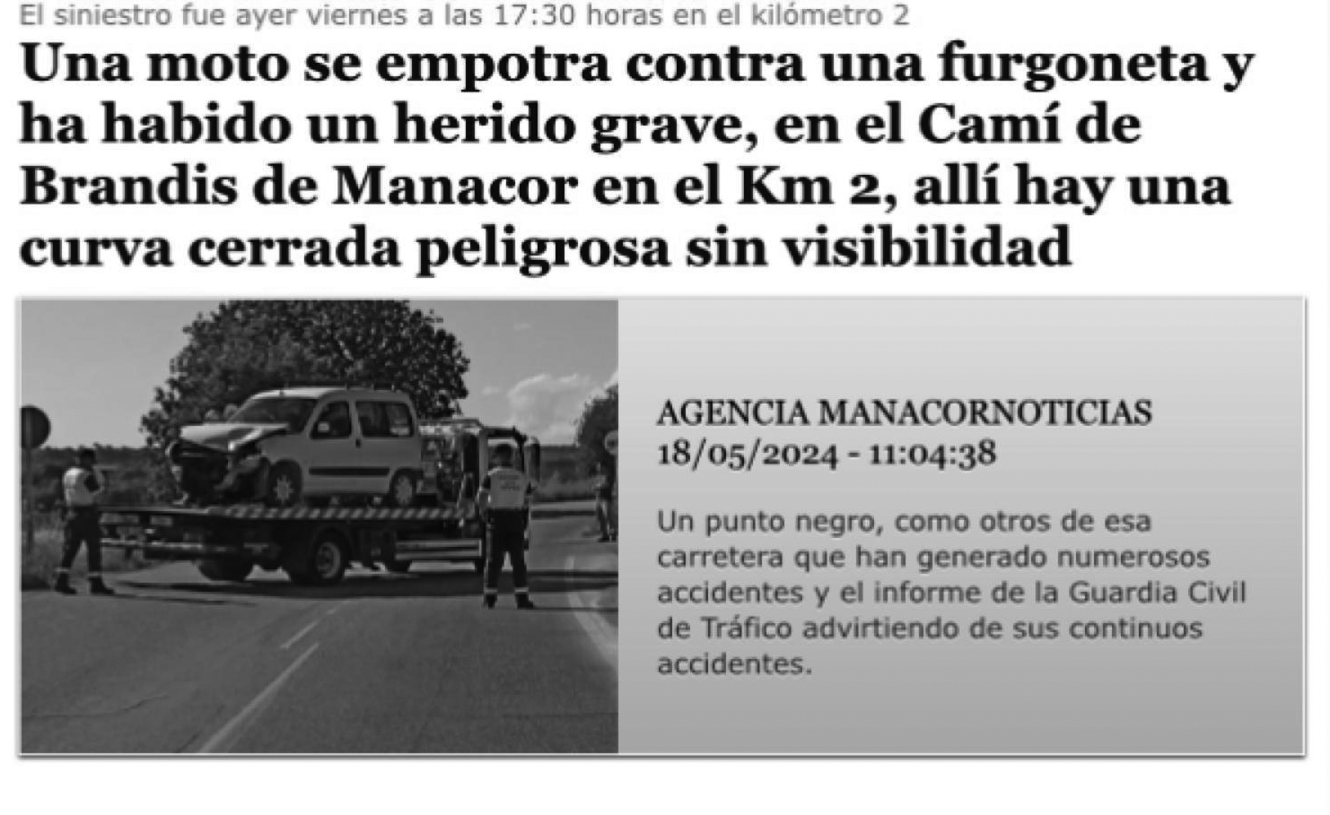 Aquesta setmana passada els col·legues de Manacor Noticias es feien ressò d’un accident de trànsit a un conegut camí veïnal manacorí, on s’acumulen, segons explicava la notícia. Nombrosos punts negres. Els revolts tancats i les imprudències dels conductors suposen un còctel infal·lible que garanteix accidents setmana rere setmana. Si a això hi afegim que el camí es diu “de Brandis” tenim la tumbersa assegurada. Llegírem la notícia de prim compte i podem confirmar que no es tracta d’un error de picatge, sinó d’una etilització conscient del nom originari, que ha passat d’anomenar-se “de Bandrís” a dir-se “de Brandis”. Caldrà veure ara si qualque dia la carretera de la Comuna de Petra acaba dient-se “de Brindis” i ja tendríem la festa completa.