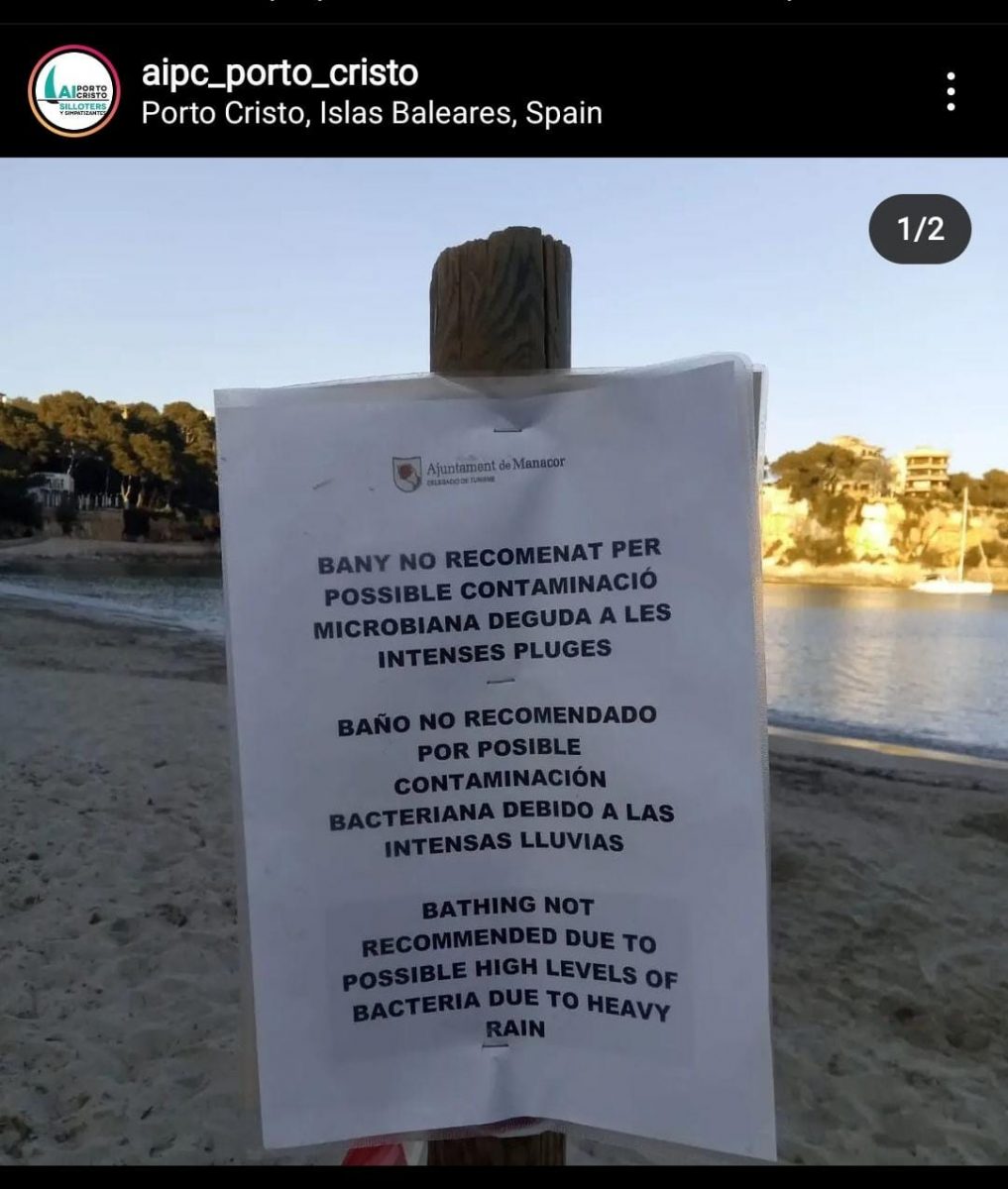 Aquest cartell apareixia aquesta setmana passada a la platja de Porto Cristo recomanant que els eventuals banyistes s’abstinguessin de banyar-s’hi, arran de les “intenses pluges” d’aquests darrers dies. Primer de tot caldria demanar-se què entenen els autors del cartell per “intenses” atesa l’eixutor de la primavera d’enguany… En segon terme, crida molt l’atenció que després de mesos d’esperpent a la primera línia portenya per resoldre la barreja de pluvials i fecals el problema encara persisteixi… I només un darrer detallet, quina llàsstima que l’única falta d’ortografia del rètol, casualitats de la vida, sigui en la llengua pròpia del país…