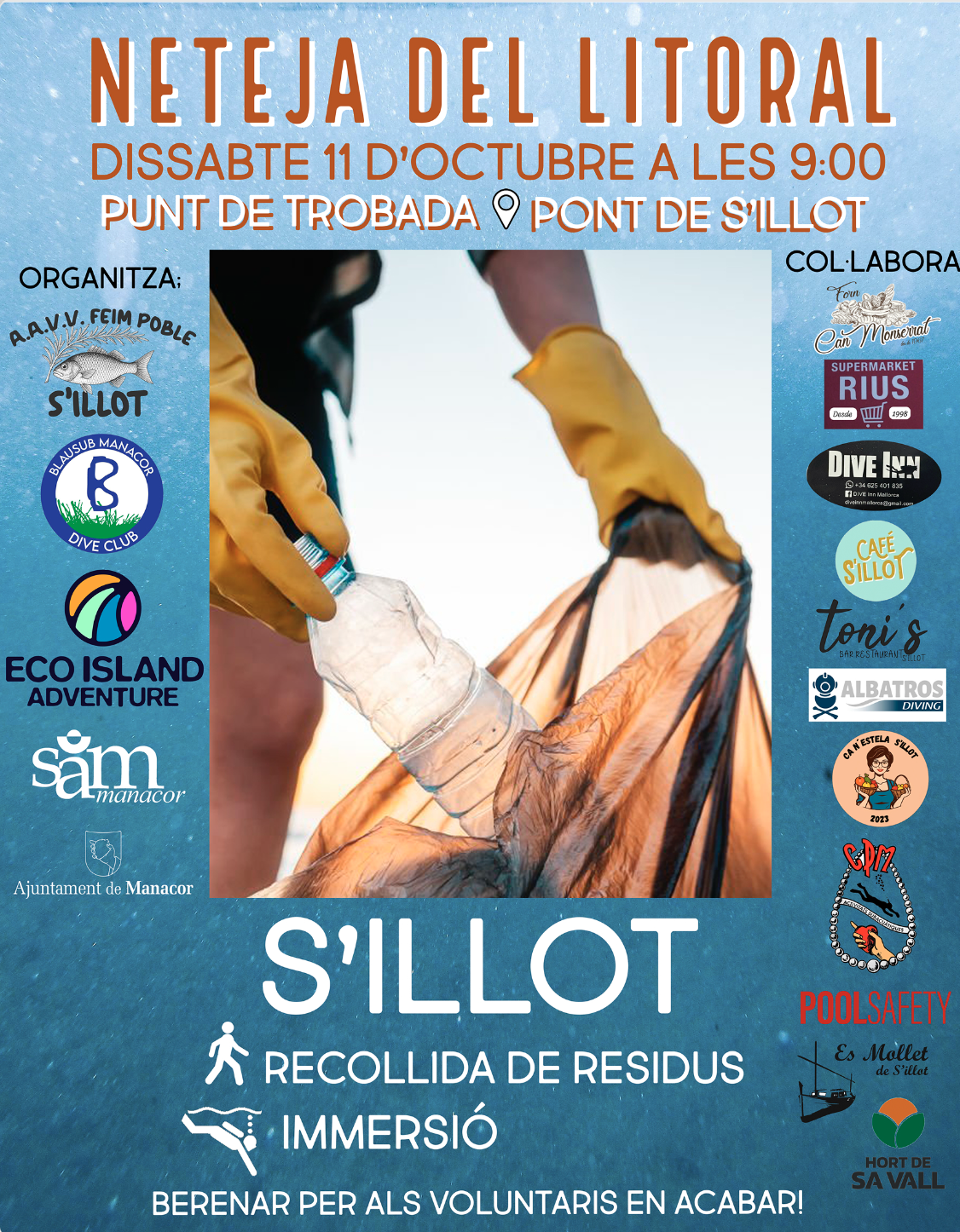 L’associació de veïnats de s’Illot, Blausub, EcoIsland Adventure, la SAM i l’Ajuntament de Manacor convoquen tothom qui vulgui a una recollida de residus per la costa, de manera manual així com persones que puguin fer immersió submarina per retirar residus de dins la mar.