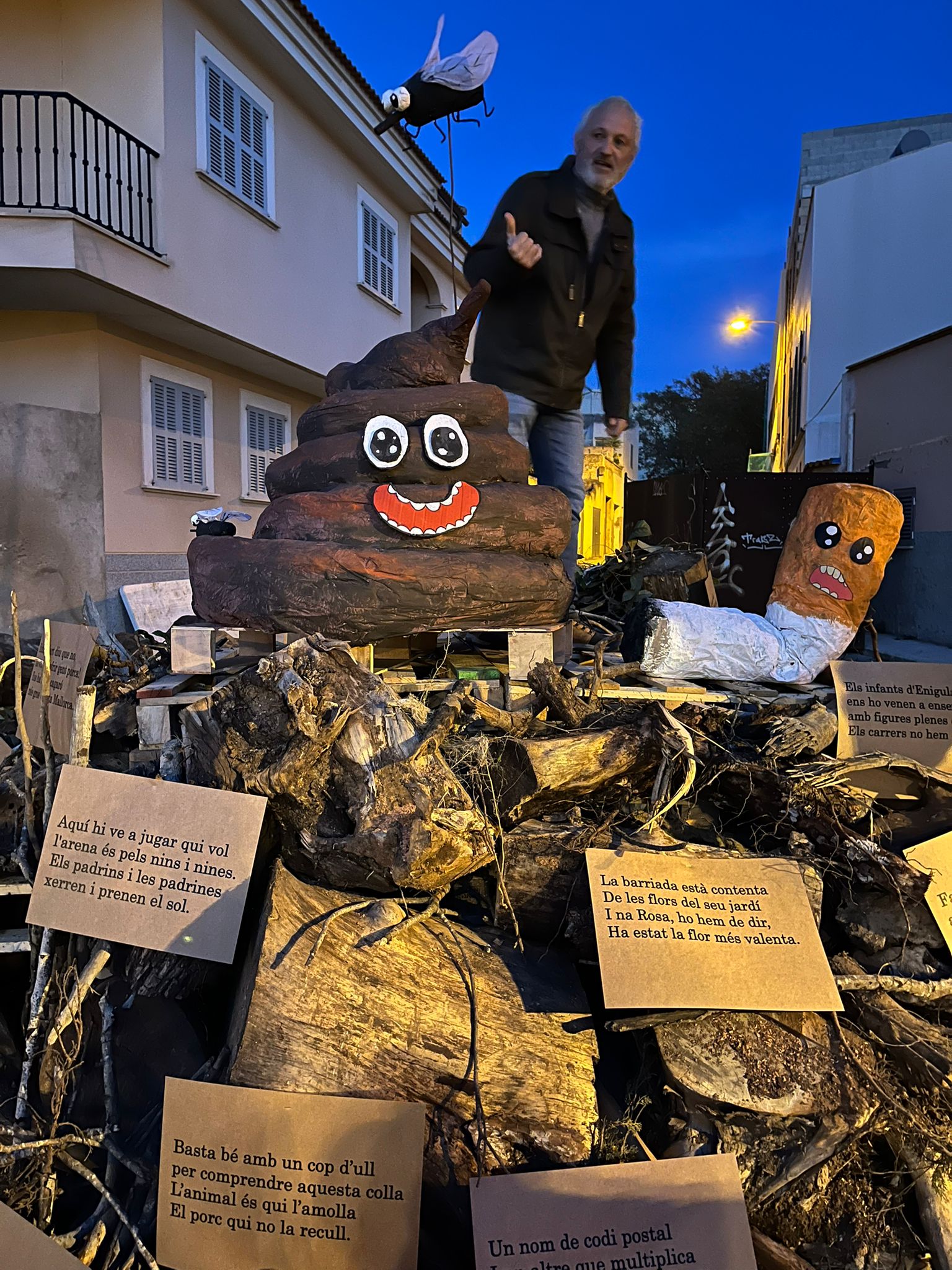 El fogueró presentava una gran cacota amb una mosca ben contenta que l’ensumava i una llosca gegantina, en referència a la brutor que s’acumula precisament en els jocs de la plaça de Berard. Els veïnats organitzaren una rifeta per arreplegar doblers per pagar el policlín que havien hagut de costejar per evitar que qualque incívic fes un roi per un capdecantó.