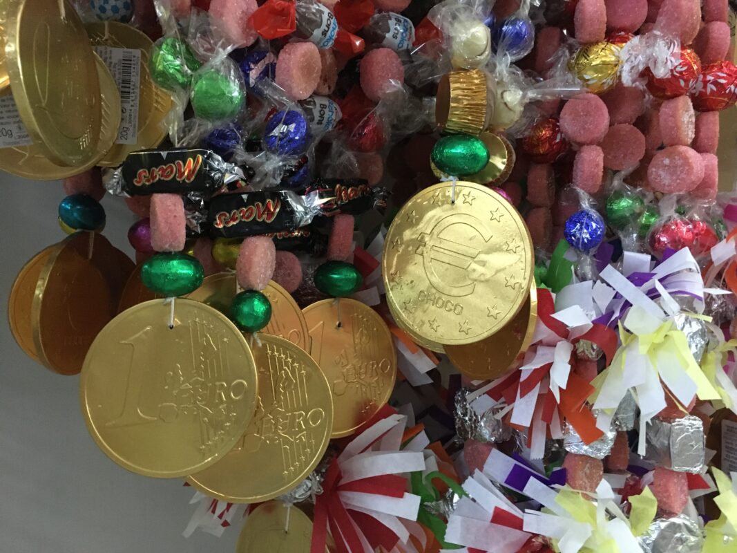 e) Sé que és un rosari, és un collar que està fet de llepolies o de bombons. Me n’han regalats. La meva tia me’n va regalar un de cromos i tot.