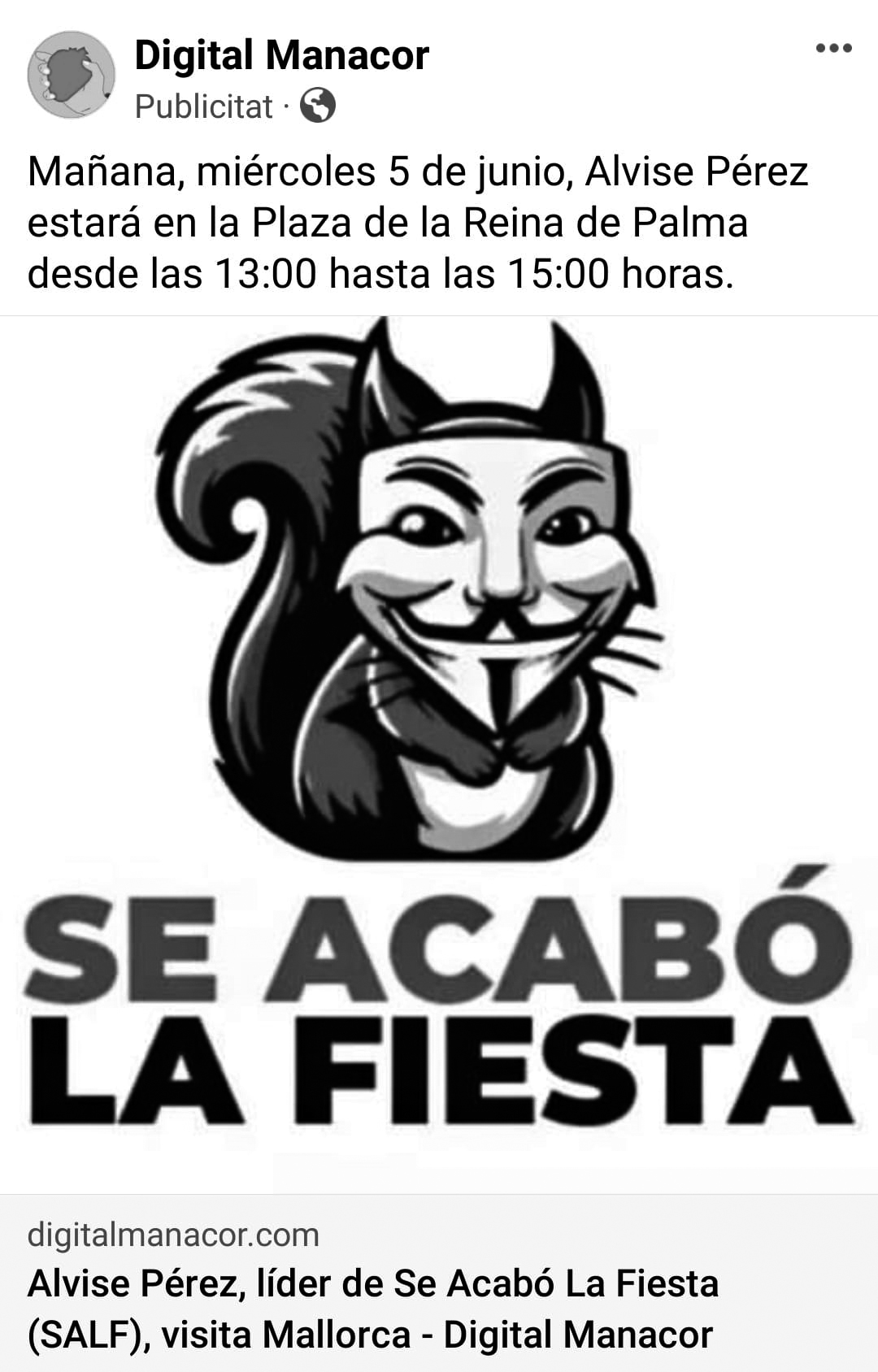 El director de Digital Manacor se sol enfadar amb aquesta secció quan qualificam la seva publicació com a d’extrema dreta. La setmana abans de les eleccions europees José Antonio Argiz i Digital Manacor es feien ressò de l’acte de “Se acabó la fiesta” i el seu líder Alvise Pérez, un influencer a qui Twitter ha bloquejat el compte per difondre falsedats i que ha creat una candidatura per a la gent dretaneta descontenta de Vox, a qui ell considera uns “corruptes i acomodats”. Populista llibertarià, trumpista i espanyolista a prova de bomba, Pérez té més de 800.000 seguidors a Instagram. La cosa curiosa és que Digital Manacor no només es fa ressò de la cosa, sinó que paga per fer-ne. Molt li deu agradar, el personatge!