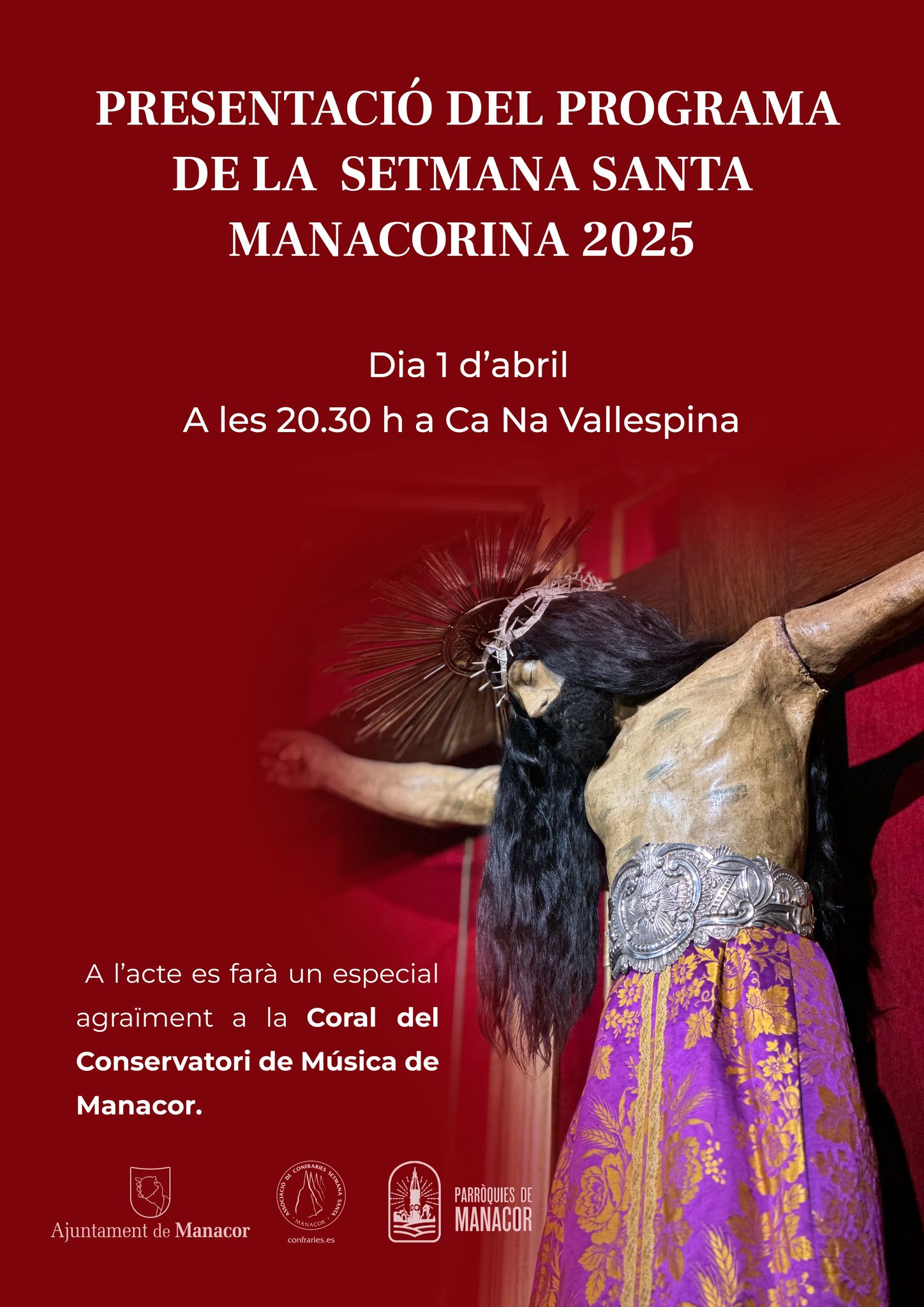 L’Associació de Confraries de Setmana Santa de Manacor ja ho té tot a punt perquè comencin els actes de les festes de la setmana de Passió. La presentació del programa d’actes d’aquest any 2025 serà dilluns dia 1r d’abril a les 20:30h al local parroquial de Ca Na Vallespina.