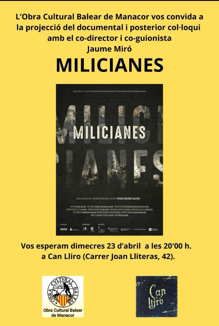 El pròxim dimecres, 23 d’abril, tindrà lloc a les 20 hores a Can Lliro de Manacor, una altra edició del Dimecres de l’Obra, organitzada per l’Obra Cultural Balear de Manacor. En aquesta ocasió, es projectarà el documental Milicianes, realitzat pels directors Tània Balló i Jaume Miró, produïda per Nina i Cinètica Produccions, amb la coproducció de TV3 i IB3.