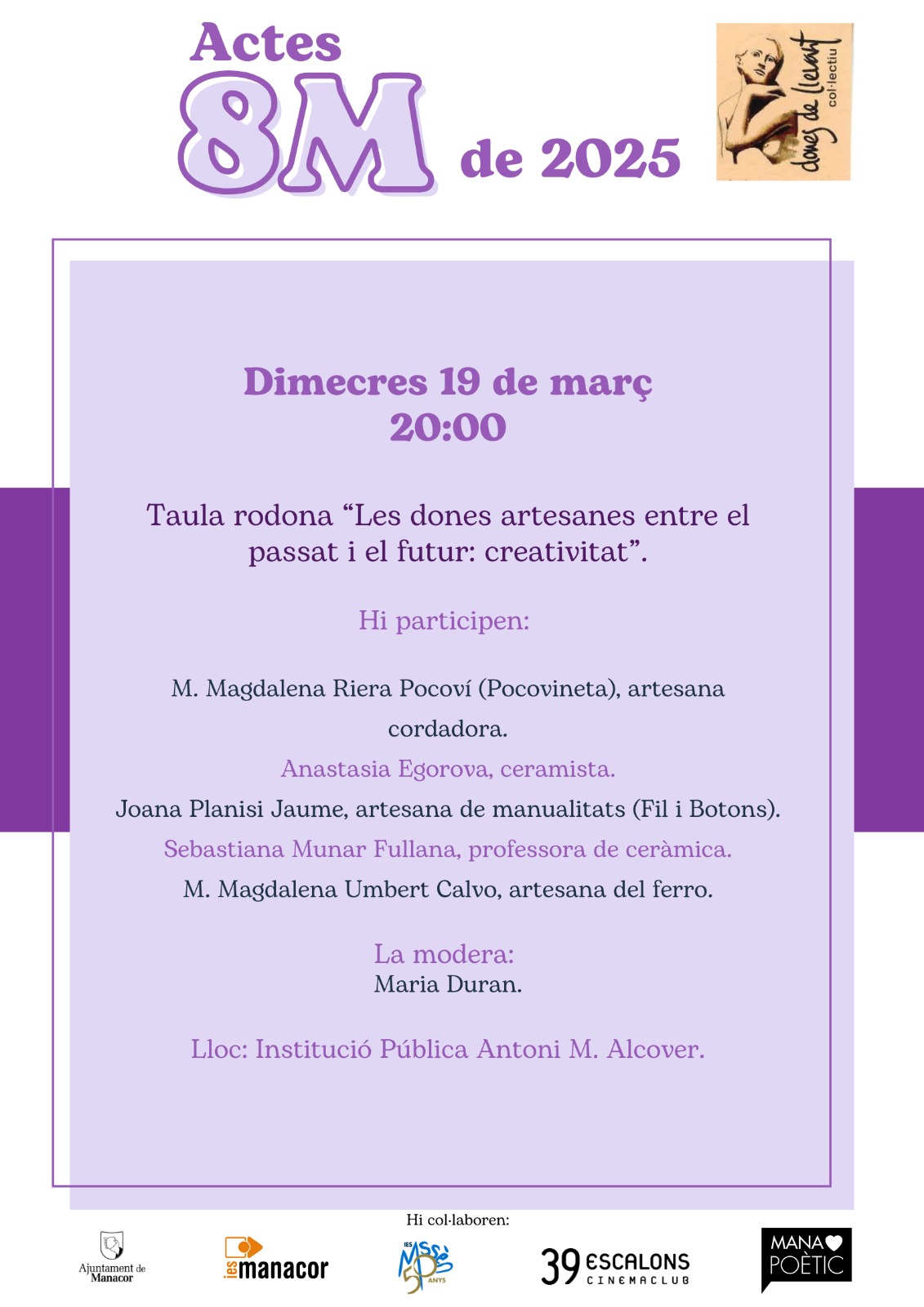 Amb l’objectiu de conversar sobre el binomi de dona artesana i cultura i creativitat així com les connexions sobre passat, present i futur de l’artesania, com influeix el fet de ser dona en la creativitat o les peculiaritats de cadascun dels oficis, la taula compatarà amb la participació de Maria Magdalena Pocoví (Pocovineta), artesana cordadora; la ceramista Anastasia Egorova; l’artesana de manualitats de Fil i Botons Joana Planisi, la professora de ceràmica, Sebastiana Munar i l’artesana del ferro, Maria Magdalena Umbert.