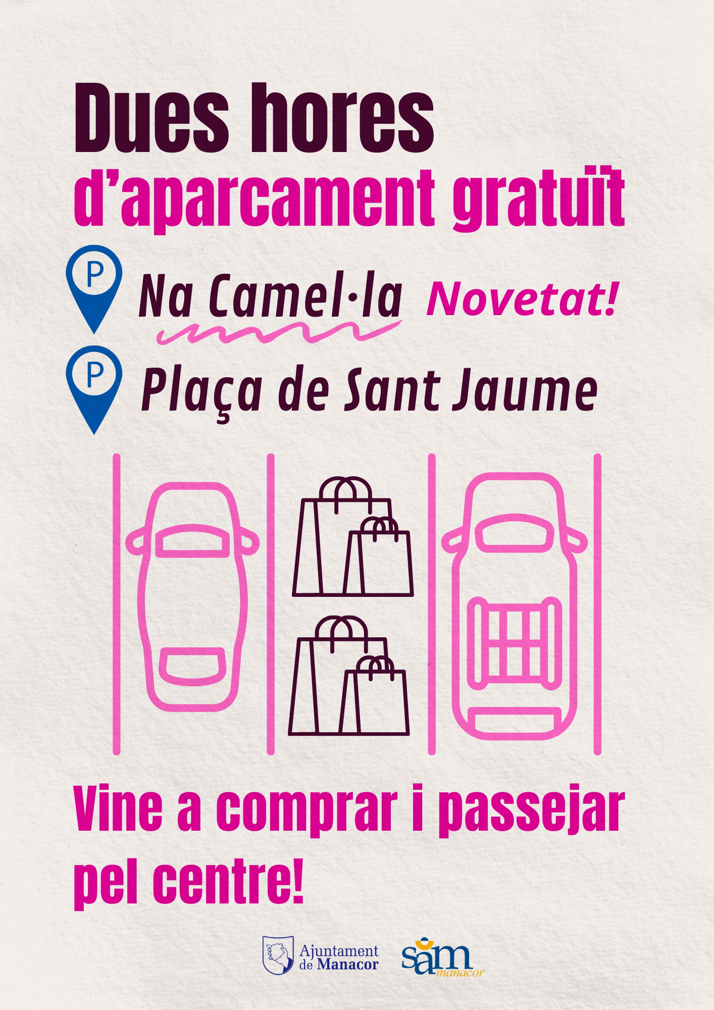 L’Ajuntament de Manacor i l’empresa municipal de serveis SAM han acordat ampliar la gratuïtat de dues hores d’aparcament, que fins ara s’aplicava a l’aparcament subterrani de la plaça de Sant Jaume, també al de Na Camel·la. Aquesta mesura, que ja està en vigor, té l’objectiu de facilitar l’accés al centre de Manacor, incentivar el comerç local i promoure una mobilitat més sostenible en un entorn pacificat pel trànsit.