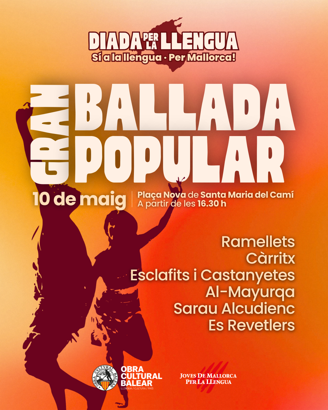 L’Obra Cultural Balear (OCB) i Joves de Mallorca per la Llengua (JMxLL) organitzen una gran ballada popular el pròxim 10 de maig, a partir de les 16.30 h, a la plaça nova de Santa Maria del Camí. Una celebració festiva i reivindicativa que, en el marc de la Diada per la Llengua, pretén reunir milers de balladors per defensar, celebrar i reivindicar la llengua i la cultura pròpies.