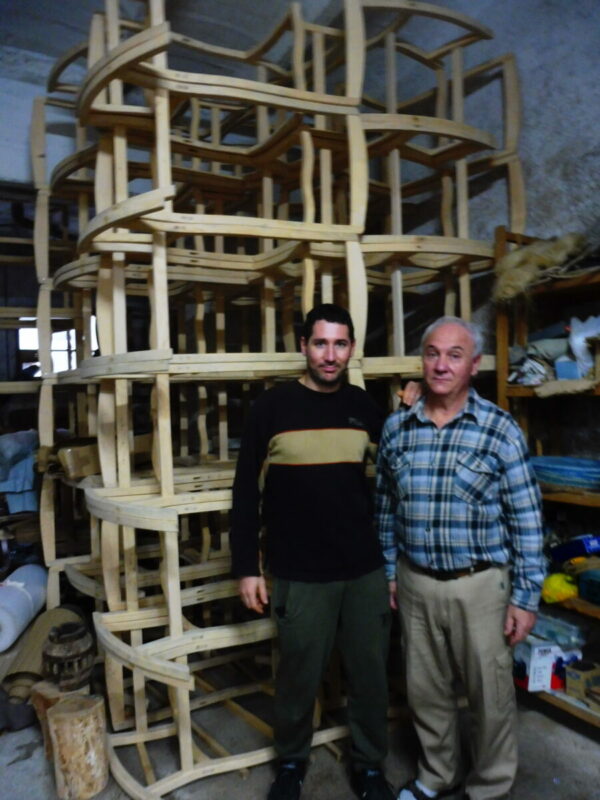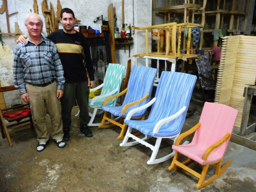 Pep Gelabert ha afat el relleu de son pare, Miquel, al capdavant de Balancins Gelabert. “Aquí ja hi va fer feina mon pare i dos german”, diu Miquel. Es tracta per tant, d’una empresa que ara arriba a la tercera generació. Son pare va caure malalt i ho va agafar ell amb el seu germà, que va deixar el negoci arran de la crisi del 2007. Ara és Pep, el seu fill, qui n’agafa el relleu: “Jo ja he fet els seixanta-cinc”, diu.Quan ho duia la primera generació feien cadiram i balancins, però a poc a poc decidiren dedicar-se exclusivament als balancins. “Mon pare va fer les plantilles a partir d’un balancí que tenia la meva padrina al sòtil, i encara són les que empram ara”, diu Miquel. “La faixa és el respatler de dalt, els travesser,s la barra voltada de davant, la cama llarga, les cames petites, els braços, i la vogadora, que és la peça que permet que el balancí s’engronsi”, aquestes són les parts d’un balancí mallorquí, ens expliquen Pep i Miquel. La part més difícil de la seva feina és “bogir la fusta”, en referència al fet de dibuixar-hi les formes voltades amb les serres del sinfí. Es fan servir fins a tres tipus de serra, per fer aquesta feina.