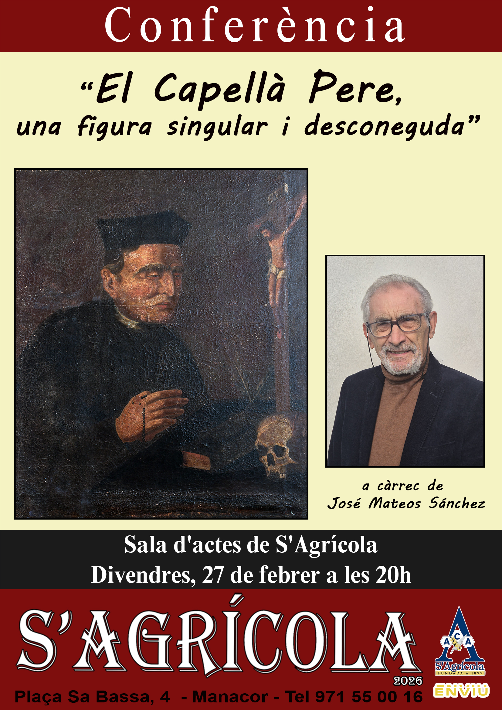 El pròxim divendres 27 de febrer a partir de les 20 h la sala d’actes de S’Agrícola acollirà la conferència “El capellà Pere, una figura singular i desconeguda” a càrrec del professor jubilat José Mateos Sánchez.