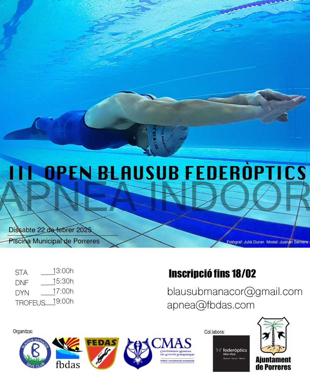 Aquest dissabte tendrà lloc a la piscina municipal de Porreres, el tercer Open BlauSub d’apnea en piscina. Hi haurà tres modalitats de participació: l’estàtica, que consisteix a aconseguir el major temps possible aguantant la respiració, flotant en superfície; la dinàmica sense aletes i dinàmica amb aletes, que es basen a recórrer la major distància horitzontal possible aguantant la respiració.