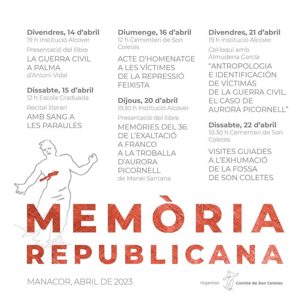 Tots aquests fets, o potser la constància de no amollar mai, han fet que el Comitè de Son Coletes hagi preparat més actes que mai per a aquest mes d’abril. Així, a l’acte central que com sempre tendrà lloc al cementeri manacorí el primer diumenge després de dia 14, dia de la proclamació de la II República espanyola, a les 12h del migida, s’hi afegeixen ara dues presentacions de llibres. La primera tendrà lloc divendres dia 14, precisament, a la Institució Alcover, on Antoni Vidal presentarà el volum “La guerra civil a Palma”. L’altre llibre és obra de l’historiador de Consell Manel Santana, que fa anys que viu i fa feina a Manacor. El professor de secundària i escriptor presenta un assaig que ha titulat “Memòries del 36, de l’exaltació a Franco a la troballa d’Aurora Picornell”. L’acte de presentació serà també a la Instució Alcover dijous dia 20 d’abril, a les 19.30h.