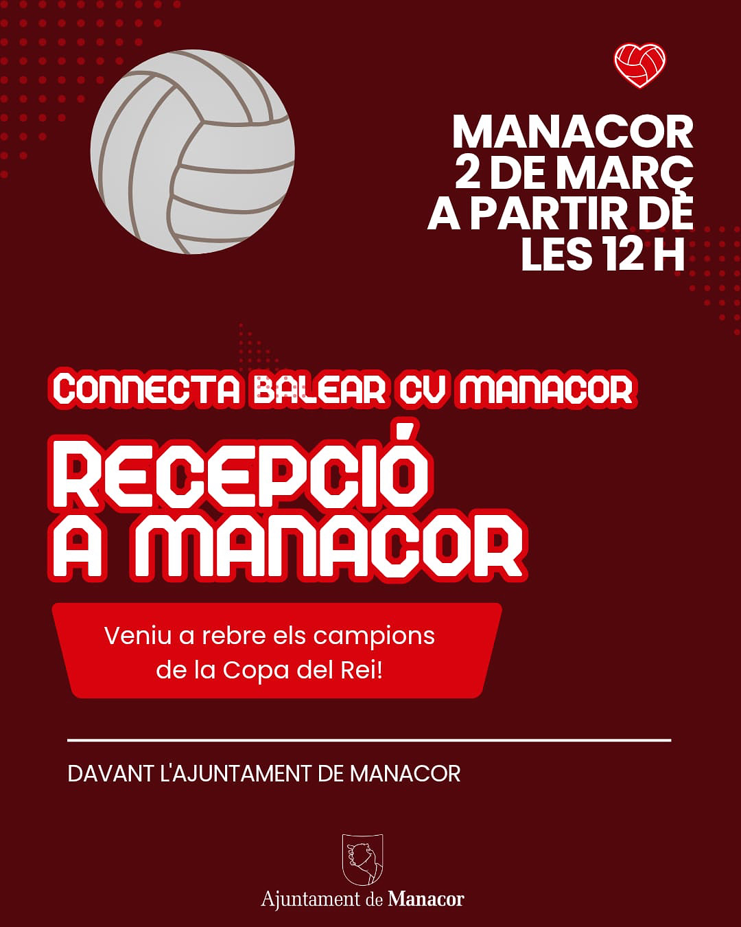 Així mateix, l’Ajuntament ha informat a través de les xarxes socials que avui a partir de les 12 h hi haurà una rebuda institucional de l’equip i conviden tota la ciutadania a participar-hi: “Manacor té una cita amb els campions! Arriben els guanyadors de la Copa del Rei! Sortim al carrer i fem-los sentir l’orgull d’un poble que els ha empès fins a dalt de tot! Davant l’Ajuntament a partir de les 12 h Veniu a rebre l’equip, veniu a celebrar, veniu a fer història junts. Manacor és campió!”.