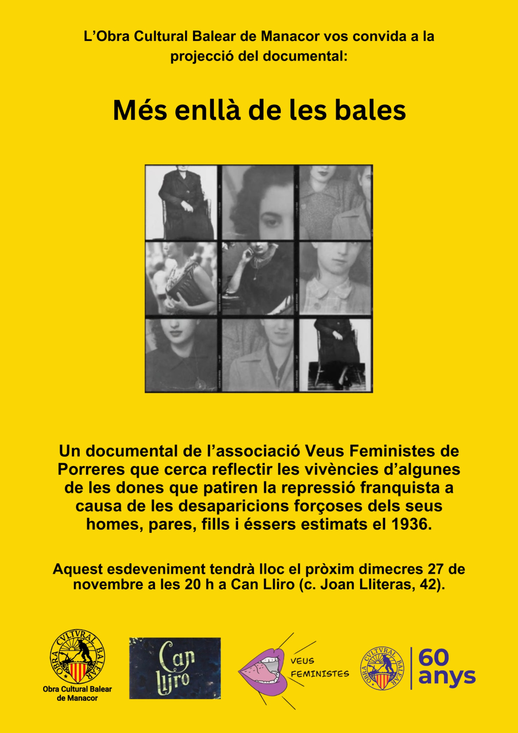 Avui en el marc del Dimecres de l’Obra, a les 20 hores a Can Lliro, tendrà lloc la projecció del documental: “Més enllà de les bales” que cerca reflectir les vivències d’algunes de les dones que patiren la repressió franquista a causa de les desaparicions forçoses dels seus homes, pares, fills i éssers estimats el 1936.