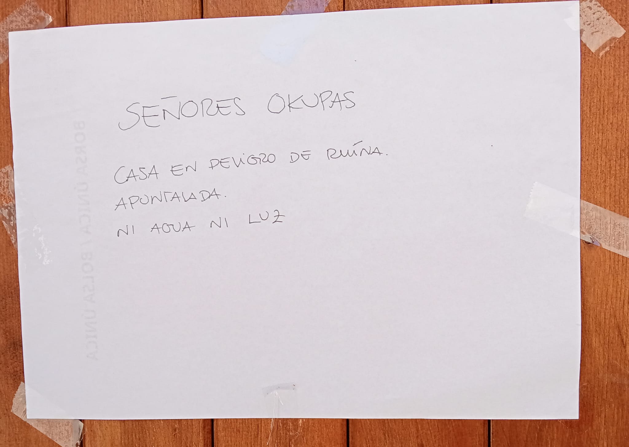 La madona d’aquest pis a un cèntric carrer de Manacor va veure com havien intentat entrar-hi, hom no sap si amb la intenció de robar o amb la de quedar-hi a romandre. El cas és que va voler deixar clar que la casa no estava en condicions de ser habitada i es va adreçar directament als ocupadors amb aquest rètol que advertia que, a més d’estar apuntalada, la casa no disposa d’aigua ni de llum. Certament, fa mal tenir ganes d’estar-hi, amb aquesta propaganda. Veurem si treu cap enlloc, la cosa!