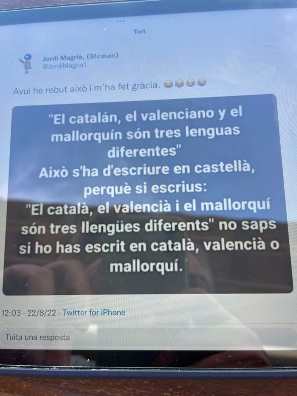 Si hom vol inscriure el nom d’un fill seu o d’una filla, pot triar l’idioma amb què ho vol fer al registre civil. Resulta curiós que l’administració espanyola prevegi l’opció del català, però també la del valencià (escrits tots dos en la nostra llengua), i fins i tot la del “mallorquín”, aquesta, però escrita en una llengua que no és el mallorquí. En qualsevol cas, als inventors d’aquesta moderníssima i avançada filologia de panfonteta, per ventura els convendria aplicar-se la medecina de la imatge amb que cloem avui aquesta secció. Llegiu aquí baix.