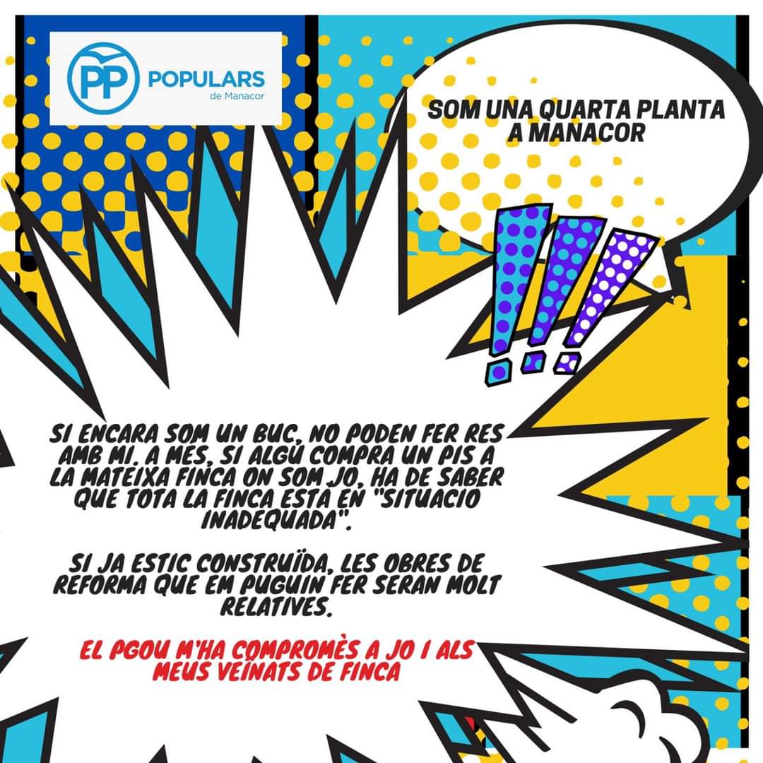 La gent carregada de prejudicis se sol errar de comptes moltes de vegades. Hom podria tenir una imatge del Partit Popular que oscil·làs entre allò ranci i allò altre més estantís. Entre aquella cosona composteta i aquella altra més mudada. Sempre per quedar bé. Però alerta. El PP manacorí demostra que tothom que pugui pensar així s’equivoca. Vegeu, si no, l’espectacular bàner que ha començat a distribuir per xarxes el partit que lidera a Manacor Maria Antònia Sansó. Amb una estètica que recorda més uns dibuixos manga del segle XXI que no el moralisme sentimental d’una Heidi dels anys vuitanta, el PP és capaç, fins i tot, d’arribar a imaginar què podria pensar “una quarta planta” davant el nou Pla General d’imminent aprovació. Poca broma amb els creatius populars, que poc o molt recorden l’agosarada campanya d’Unides Podem a Manacor, amb aquell GrimTeam liderat per l’incombustible i polifacètic capità Team.