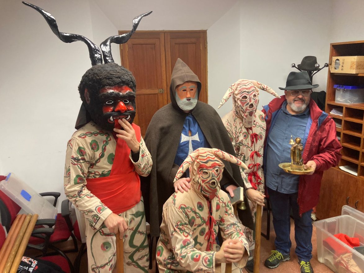 Mentrestant, dins una de les sales de l’Escola de Música, l’equip titular d’aquest primer partit dimonial es vesteix. A la porteria, per evitar que ningú faci cap gol a la festa, Bernat Aguiló, que enguany fa de Sant Antoni. Al centre del camp, per repartir joc i esdevenir el centre de totes les mirades, Antoni Bassa, el dimoni gros. I a davant, un estilet punyent i ràpid que correrà per la banda, el dimoni petit Antoni Juan, Aleix. I per rematar, corpulent, un davanter centre potent, l’altre dimoni petit, Joan Antoni Sunyer. Dirigeix l’equip des de la banqueta, el veteraníssim i experimentat Mateu Juan, Aleix. També convocat, Toni Lluís Reyes és a la sala per si cal suplir qualque contingència.