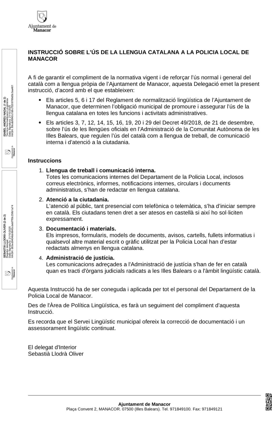 “És una mesura que hem pres per queixes de la ciutadania que en ocasions s’havien trobat amb agents que no donaven prioritat a la llengua catalana”, diu Sebastià Llodrà, que recorda que aquesta instrucció ve derivada dels usos que ja es duen a terme de forma generalitzada a la resta de departaments de l’Ajuntament, a partir del Reglament de normalització lingüística de l’administració local manacorina.