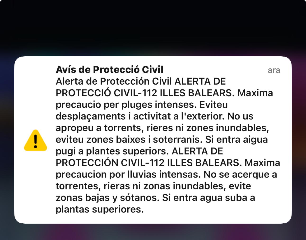Fa pocs minuts Protecció Civil ha emès una alerta directa als telèfons mòbils dels ciutadans de les Balears davant la persistència del temporal. El missatge, difós pel sistema d’alertes públiques ES-Alert, adverteix de pluges intenses i risc d’inundació, i demana a la població que eviti qualsevol desplaçament o activitat a l’exterior. Sobretot, cal evitar zones inundables, torrents i rieres així com baixos i soterranis.