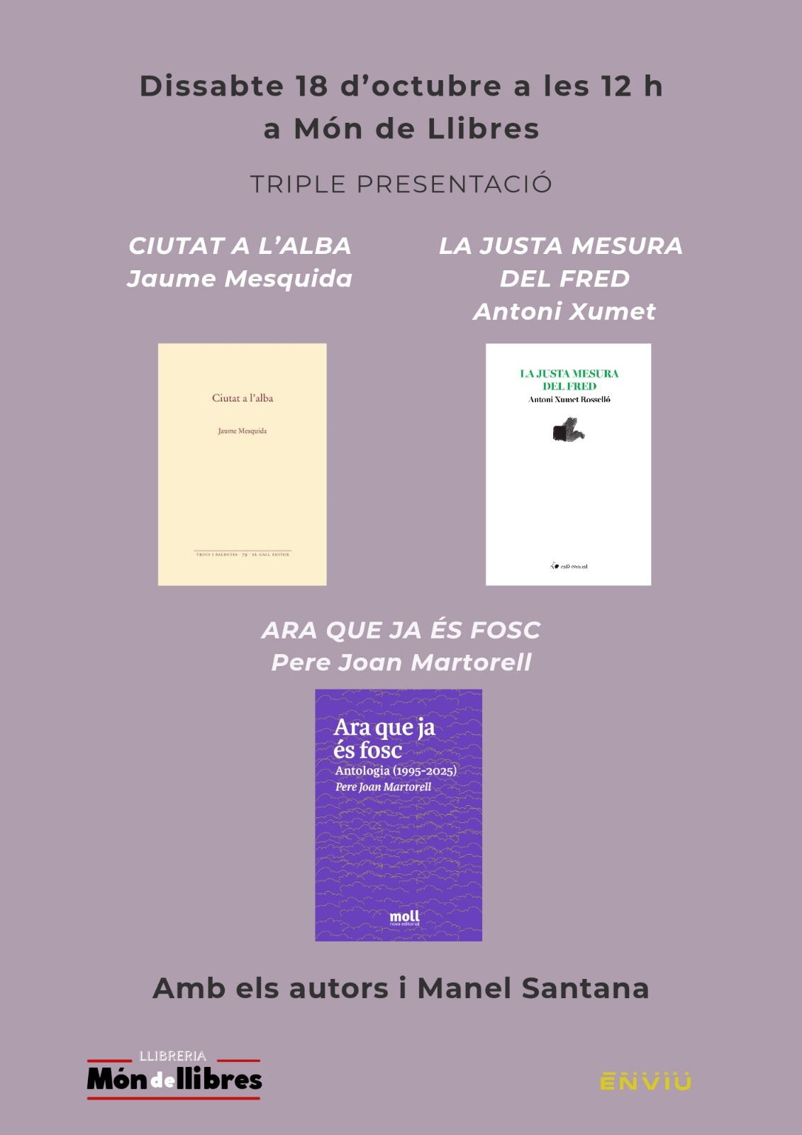 Un manacorí, un llosetí i un pollencí. Tres gentilics acabats en -i. Tres poetes. Tres homes inquiets. Tres editors entusiastes. Jaume Mesquida, Pere Joan Martorell i Antoni Xumet presenten dissabte dia 18 a les 12h els seus darrers volums publicats. Jaume Mesquida presentarà Ciutat a l’alba; Antoni Xumet, La justa mesura del fred; i Pere Joan Martorell, Ara que ja és fosc. És dona la circumstància que els tres autors varen ser socis al capdavant d’Edicions El Salobre, una aventura editorial que fundaren plegats l’any 2004.