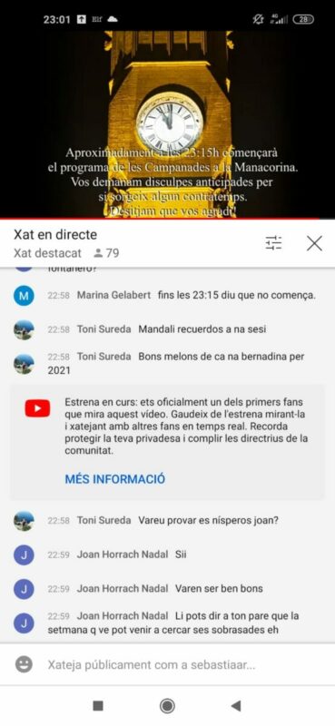 Sempre hi ha gent que té moltes feines i aprofita qualsevol moment per poder-se comunicar amb qui més ho necessita. Mentre esperaven l’emissió de les Campanades a la Manacorina pel canal de Youtube de l’Ajuntament alguns ciutadans aprofitaven per fer algunes gestions… Un cercava un llanterner: “Joan Horrach, tu eres el que trabaja de fontanero?”. Mentre altres dos parlaven de l’intercanvi frutícola que havien fet aquests dies: “Vàreu tastar els nísperos, Joan”. I en Joan responia que sí, que “varen ser ben bons”. La resposta final no podia ser més aclaridora: “Li pots dir a ton pare que la setmana que ve pot venir a cercar les sobrassades”. En una parauleta, hi ha gent per a tot.