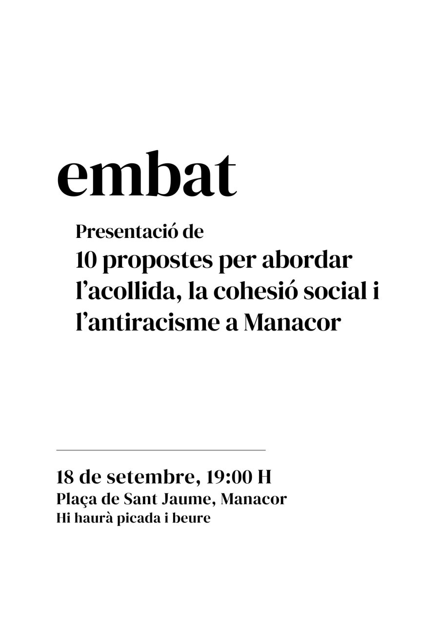 El col·lectiu Embat de Manacor ha anunciat la presentació de 10 propostes per a millorar la cohesió ciutadana a Manacor. L’esdeveniment serà dijous dia 18 de setembre a les 19 h a la plaça de Sant Jaume i comptarà amb diversos membres d’Embat que explicaran el recorregut i treball dels darrers mesos així com les 10 propostes concretes.