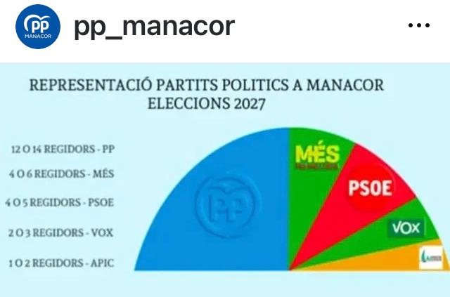 En clau més local, els companys en tasques informatives de Manacor Noticias i Documents Adjunts també han publicat els resultats de la seva enquesta, tot i que no especifiquen sobre quina mostra de població s’ha fet ni amb quina metodologia. Sigui com sigui, l’enquesta elaborada per aquests dos mitjans ja té en compte la possibilitat, o la realitat, que Manacor el 2027 compti a la Sala amb 25 regidors, atès que ja s’han sobrepassat els 50.000 habitants. Així, segons el repartiment que es desprèn del sondeig de Sigma-2 el PP aconseguiria 11 regidors. En canvi, curiosament, a Documents Adjunts la xifra encara és més espectacular i n’atorguen entre 12 i 14 als conservadors, és a dir, a punt de la majoria absoluta. Totes dues publicacions preveuen una davallada de MÉS-Esquerra, que passaria dels set regidors a quatre o cinc segons Documents Adjunts i 4 o 6 segons Manacor Noticias. El PSOE faria el sorpasso entre partits d’esquerres, i AIPC només mantendria els dos regidors actuals. Vox aguantaria el cop i pujaria de 2 a 3 regidors.