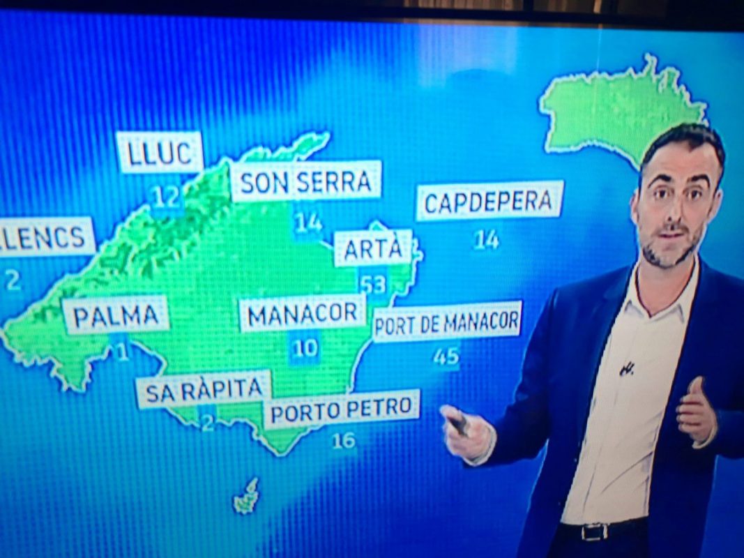 Molt d’escàndol ha provocat a Porto Cristo aquest mapa del temps sobreimpressionat a la pantalla d’IB3. Marc Caldentey, l’home del temps manacorí, explicava que al “Port de Manacor” hi havia plogut 45 litres. Es veu que no ha caigut gens bé entre la bona gent portenya que el Port fos de Manacor. Portocolom és el Port de Felanitx. D’altres ports, com el de Valldemossa, no tenen ni la possibilitat de tenir un nom exclusiu… El Port de Manacor, en canvi, tot i ser reconegut així en el decret que estableix com s’han d’escriure els topònims de les Balears, establia que les formes adequades per a aquest nucli costaner eren Portocristo i Port de Manacor. La primera ja no va anar bé, i esqueinaren fort els portenys per poder-ho escriure separat (Portocolom i Portopetro s’escriuen junts, encara ara, obedients com són en aquests redols). Ja es veu que els rebels portenys també es revoltaran aviat contra el nom de “Port de Manacor”…