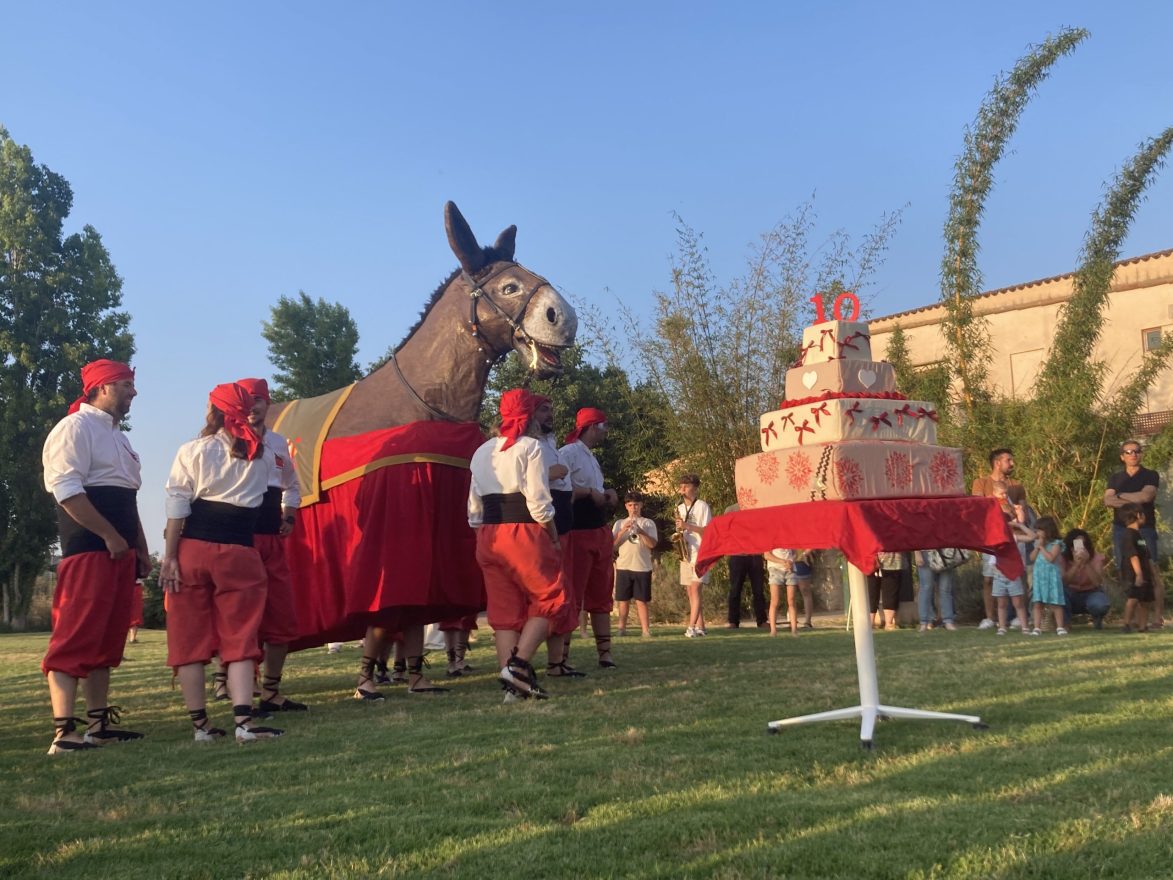 I després, la sorpresa. Senyorets per a tots els assistents, i damunt la gespa del parc del costat de l’Escola, com ara fa deu anys, la Mulassa sorti a fer un ballet i a bufar les espelmes del seu desè aniversari. I que sigui per molts d’anys més!