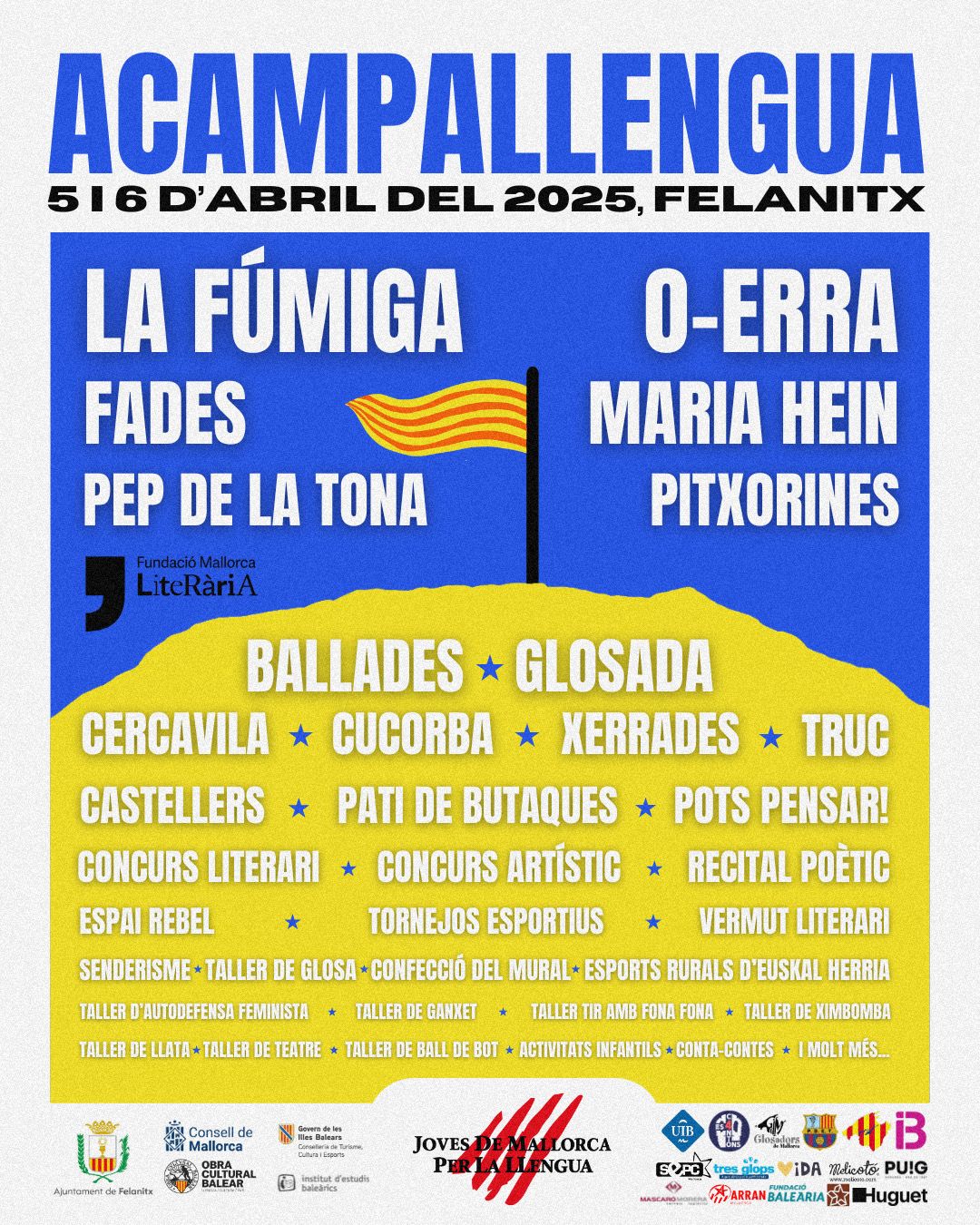 Joves de Mallorca per la Llengua ha anunciat el cartell i la programació completa de la catorzena edició de l’Acampallengua, que tendrà lloc el cap de setmana del 5 i 6 d’abril. El concert d’enguany comptarà amb les actuacions d’artistes d’arreu dels Països Catalans i amb un cartell cent per cent en català, entre els quals trobam Pitxorines, Maria Hein, O-Erra, La Fúmiga, Pep de la Tona i Fades.
