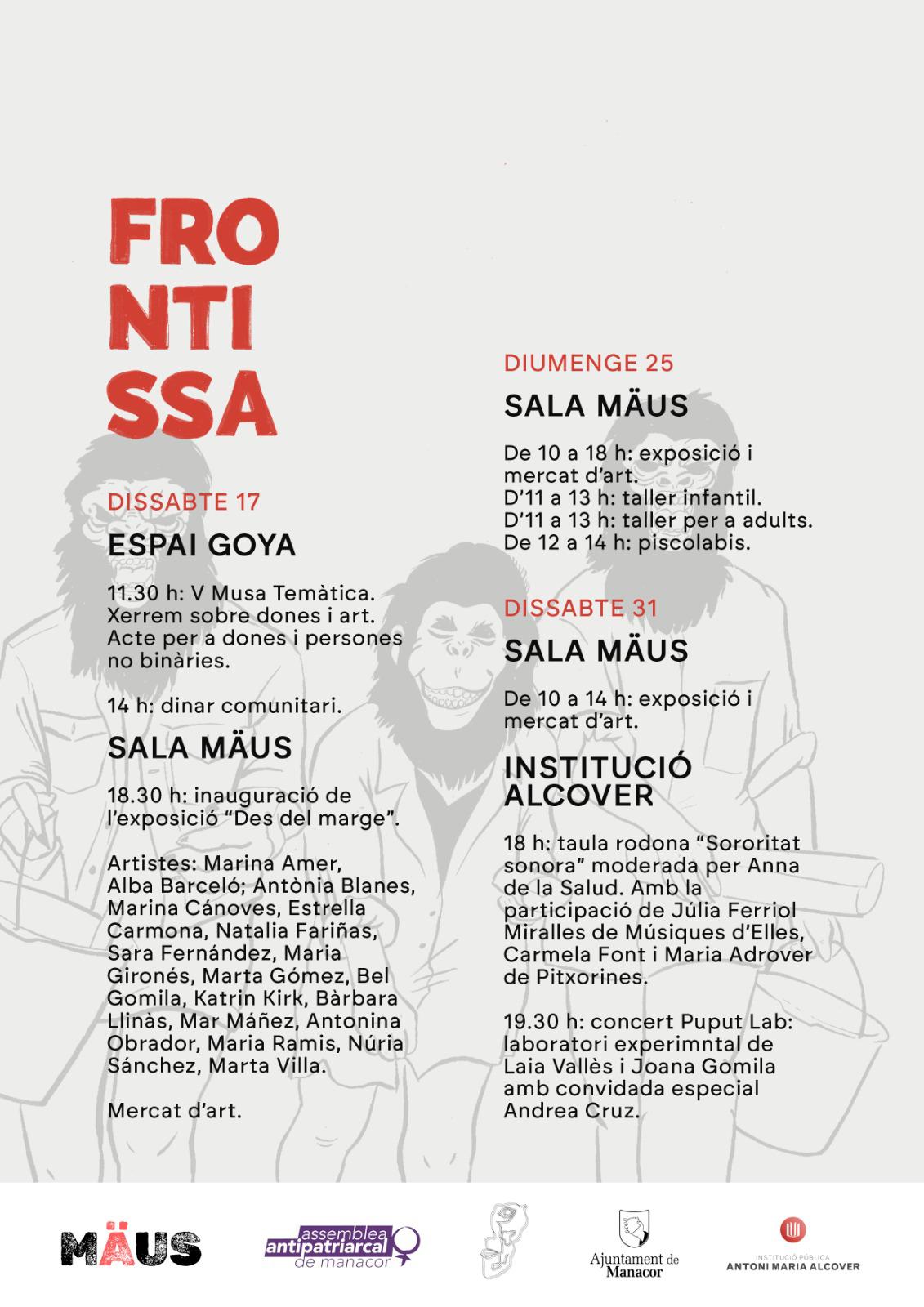 Quines connexions hi ha entre dones i art? Quins factors en comú, quines dificultats, quines necessitats? Frontissa és una iniciativa de tres col·lectius de dones de Manacor – Mäus, Lluna de Nacre i l’Assemblea Antipatriarcal, que es proposa com un espai dedicat a pensar, visibilitzar i activar el paper de les dones en el món de l’art contemporani. El terme fa referència a l’element que connecta dues parts i permet el moviment entre elles i diuen, els funciona perfectament com a metàfora per entendre la relació entre art i feminisme: no com a àmbits separats, sinó com a territoris interconnectats que es retroalimenten i s’enriqueixen mútuament.