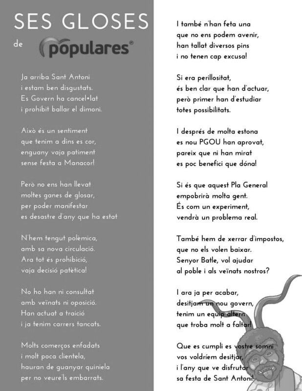 En acostar-se el dia de Sant Antoni, sempre hi ha qualque regidor que aprofita per argumentar en el ple en forma de glosa. No va ser el cas aquesta vegada. Cal dir, això sí, que com ja és tradició el grup de MÉS-Esquerra ha fet públiques unes composicions, i que enguany també s’hi ha afegit el Partit Popular. Més enllà de la fortuna tècnica i poètica de les gloses peperes (deim peperes per no dir populars, puix ho són totes, populars, les gloses del poble), s’hi percep una certa malaptesa lingüística. Just un exemple detectat a la darrera de les quartetes del Partit Popular: “Que es cumpli es vostre somni, / vos voldríem desitjar / i l’any que ve disfrutar / sa festa de Sant Antoni”. Dirien mai Maria Antònia Sansó o Maria Bel Bauzà “que es cumpli”? O dirien més aviat “que es complesqui”? Si fossen estat en espanyol, haurien comportat escriure “que se complezca” en comptes de “que se cumpla”? Ai, el bilingüisme asimètric…