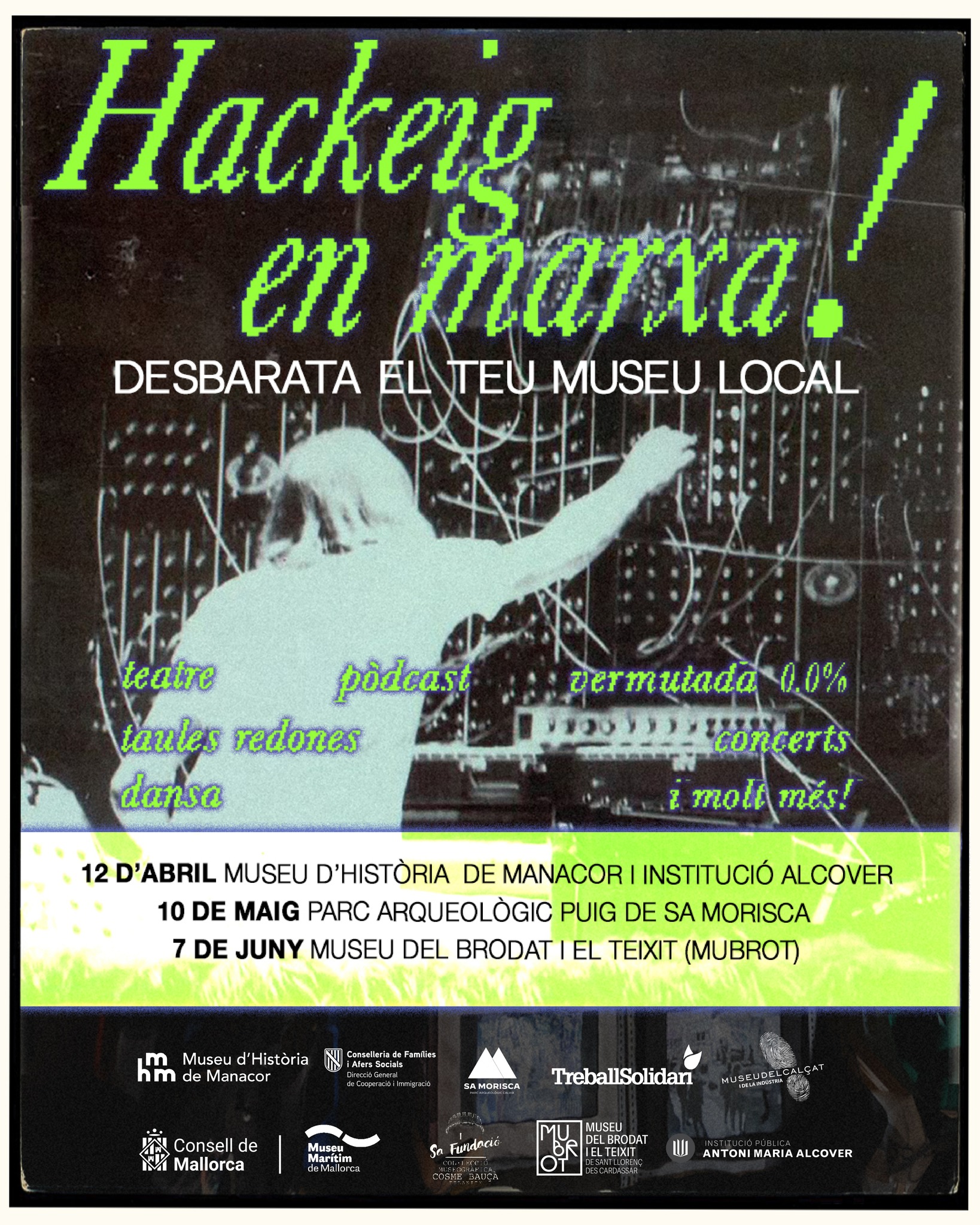 La primera jornada, el 12 d’abril, serà intensa i variada. El Museu d’Història de Manacor començarà a les 11.30 h amv “Okupa el teu museu” (teatre participatiu al Museu d’Història de Manacor): una activitat per trencar prejudicis, qüestionar normes i habitar el museu d’una altra manera. A partir de les 12 h hi haurà la presentació oficial del projecte “Hackeig en marxa”, a càrrec del col·lectiu juvenil impulsor. A les 12.15 h tendrà lloc “Desbarata el Museu” (taules rodones, mural col·laboratiu i contrassenyalització), una proposta per explorar exposicions des de mirades diverses i transformar el relat museístic amb art i debat i a partir de les 13.30 h hi haurà una vermutada 0.0% amb música de PD Rentaplats, per tancar el matí en clau festiva i sense alcohol.